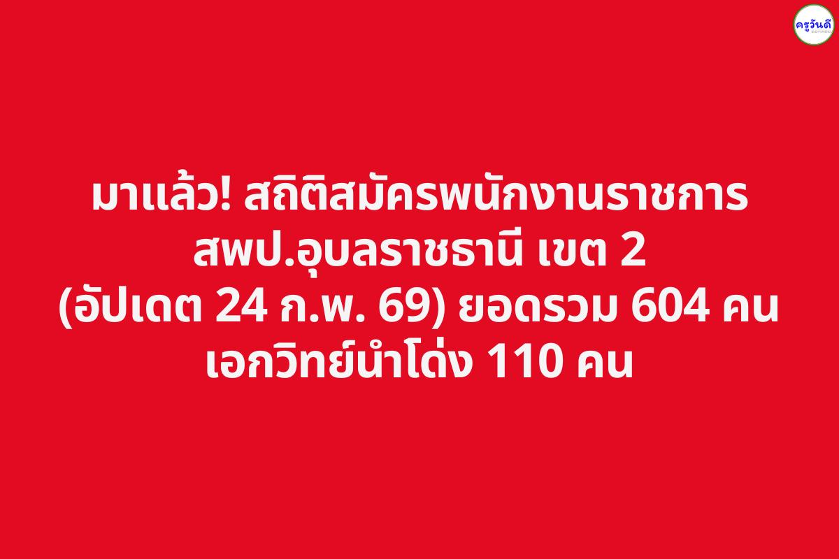รายงานความคืบหน้าการรับสมัครบุคคลเพื่อสรรหาและเลือกสรรเป็นพนักงานราชการ สังกัดสำนักงานเขตพื้นที่การศึกษาประถมศึกษาอุบลราชธานี เขต 2 (สพป.อุบลราชธานี เขต 2) ประจำวันอังคารที่ 24 กุมภาพันธ์ 2569 (วันที่ 2 ของการรับสมัคร) มียอดผู้สมัครรวมทั้งสิ้น 604 คน