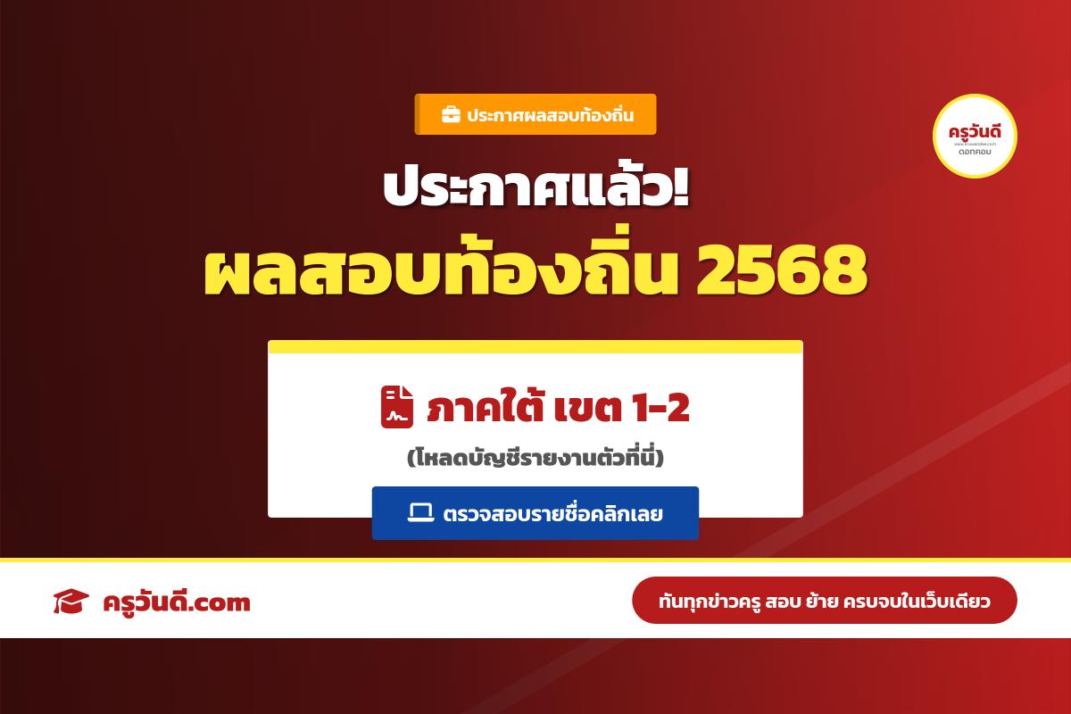 - ขอบเขตการประกาศ: เป็นการประกาศผลเฉพาะตำแหน่งในกลุ่มภาค/เขต ของศูนย์สอบภาคใต้ เขต 1 และเขต 2 ที่ดำเนินการสอบเสร็จสิ้นแล้ว