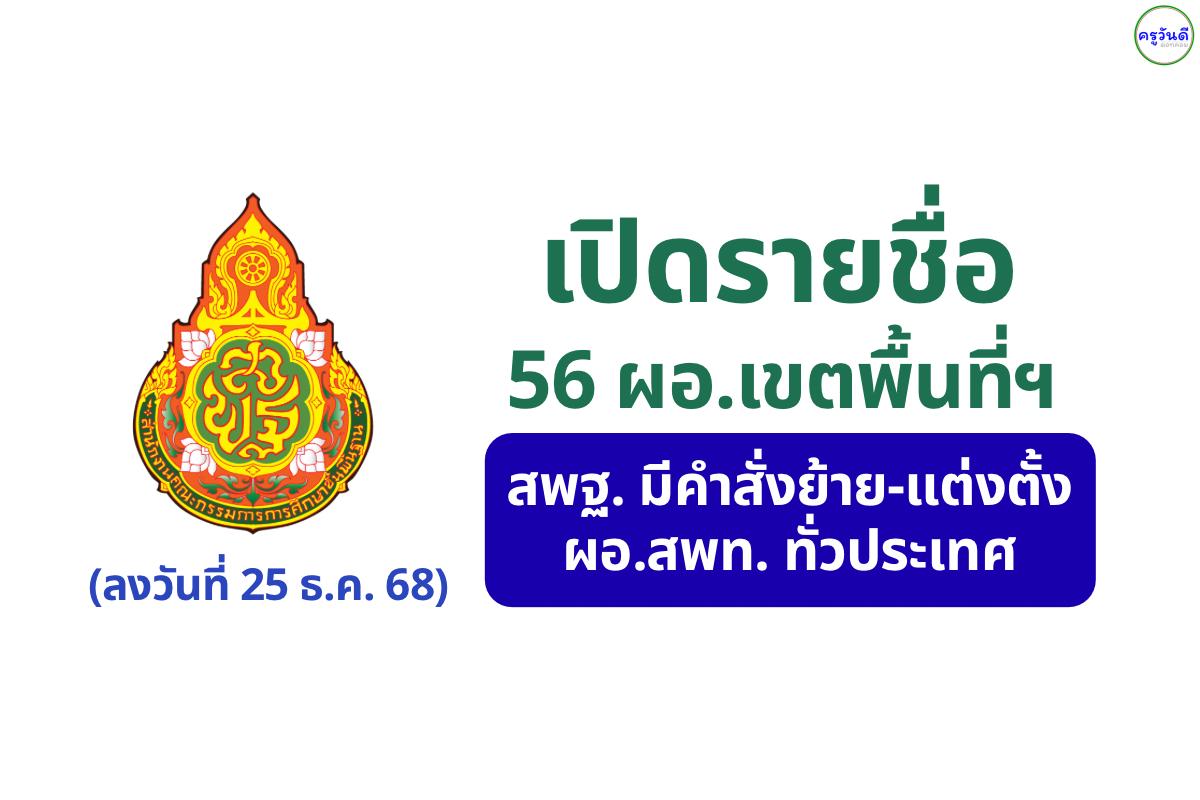 สำนักงานคณะกรรมการการศึกษาขั้นพื้นฐาน (สพฐ.) มีคำสั่งที่ 3262/2568 เรื่อง ย้ายและแต่งตั้งข้าราชการครูและบุคลากรทางการศึกษา ตำแหน่งผู้อำนวยการสำนักงานเขตพื้นที่การศึกษา จำนวน 56 ราย มีรายชื่อดังนี้ครับ
