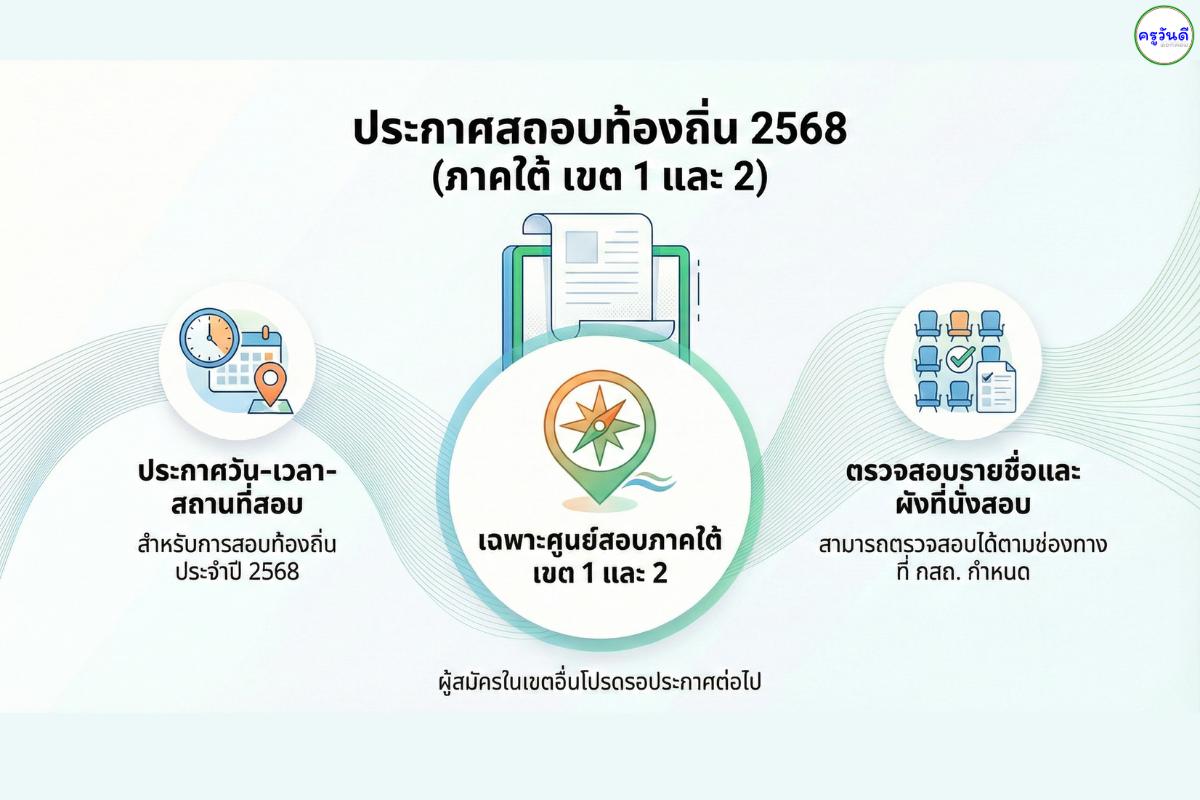 ประกาศฉบับนี้ครอบคลุมกำหนดการสอบ ภาคความรู้ความสามารถทั่วไป (ภาค ก) และ ภาคความรู้ความสามารถที่ใช้เฉพาะสำหรับตำแหน่ง (ภาค ข) สำหรับผู้ที่เลือกศูนย์สอบในภาคใต้ ดังนี้: