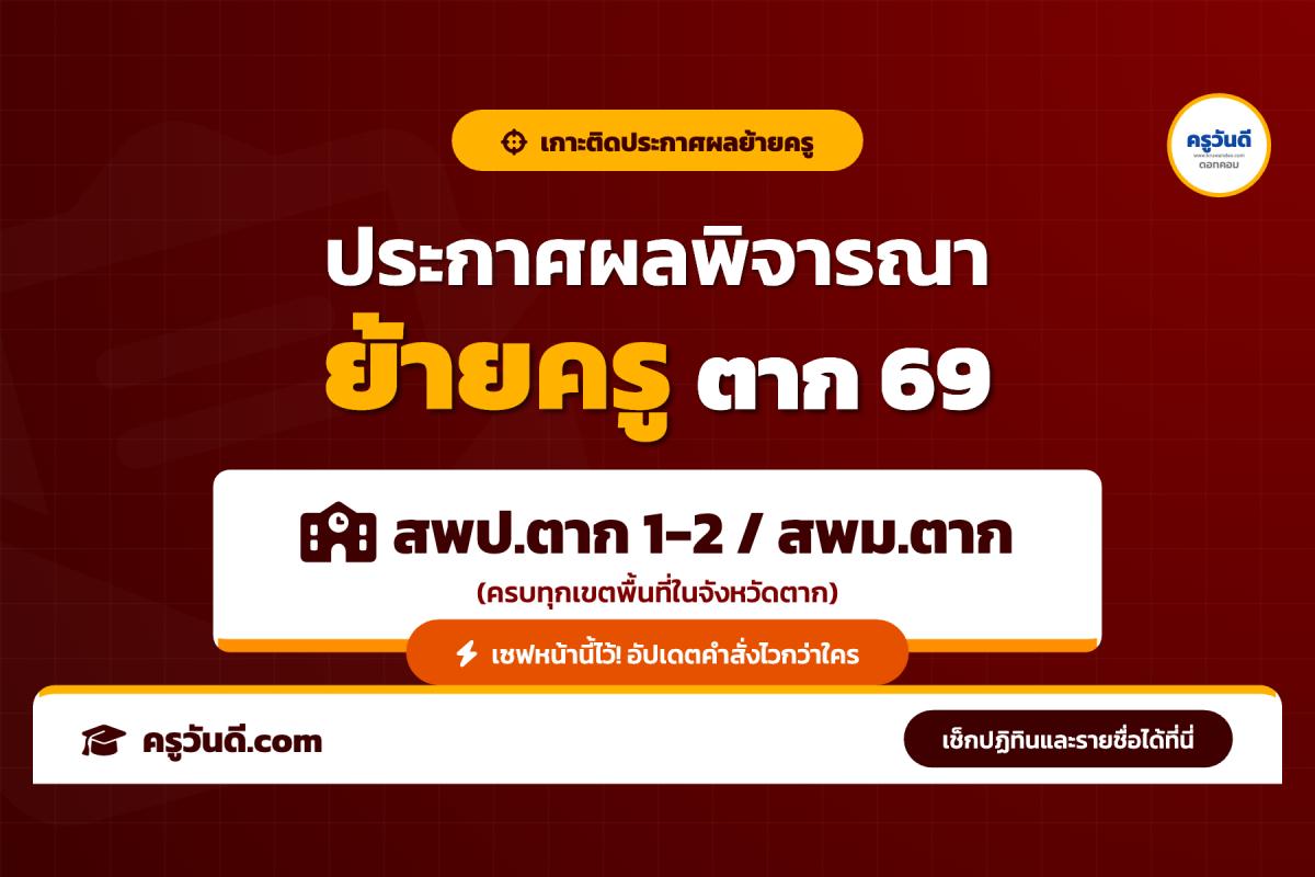 [ สรุปข่าว ] เพื่อนครูที่ขอย้ายเข้าจังหวัดตากเตรียมตัวครับ! แอดมินครูวันดีจัดทำหน้าเว็บไซต์นี้ขึ้นมาเพื่อเกาะติดสถานการณ์การประกาศผลพิจารณาย้ายข้าราชการครูและบุคลากรทางการศึกษา (กรณีปกติ) ประจำปี 2569 รอบที่ 1 ของ อ.ก.ค.ศ. เขตพื้นที่การศึกษาในจังหวัดตาก ทันทีที่มีการประกาศผลอย่างเป็นทางการ แอดมินจะนำลิงก์มาอัปเดตให้ท่านตรวจสอบรายชื่อและดาวน์โหลดคำสั่งย้ายแบบแยกเขตพื้นที่ได้ที่นี่ทันทีครับ