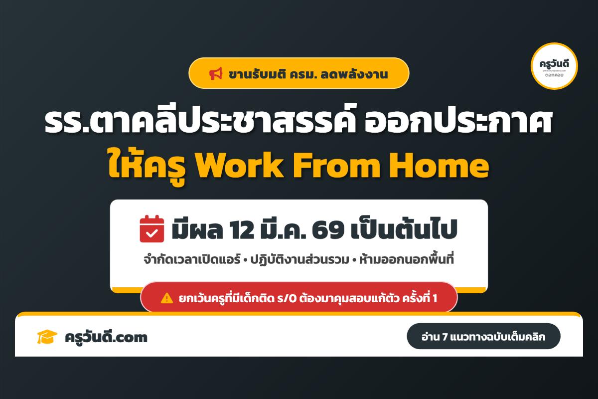 สรุปข่าวการศึกษา: สถานศึกษาในหลายพื้นที่ทยอยออกประกาศขานรับนโยบายประหยัดพลังงานของทางภาครัฐอย่างต่อเนื่อง ล่าสุด โรงเรียนตาคลีประชาสรรค์ ได้ออกประกาศแจ้งถึงข้าราชการครูและบุคลากรทางการศึกษา เรื่อง แนวทางการปฏิบัติงานนอกสถานที่ตั้งของสถานศึกษา (Work From Home) อย่างเป็นทางการ โดยมีผลบังคับใช้ตั้งแต่วันที่ 12 มีนาคม 2569 เป็นต้นไป แอดมินครูวันดีได้สรุปสาระสำคัญและ 7 แนวทางปฏิบัติมาให้ตรวจสอบกันอย่างละเอียดครับ