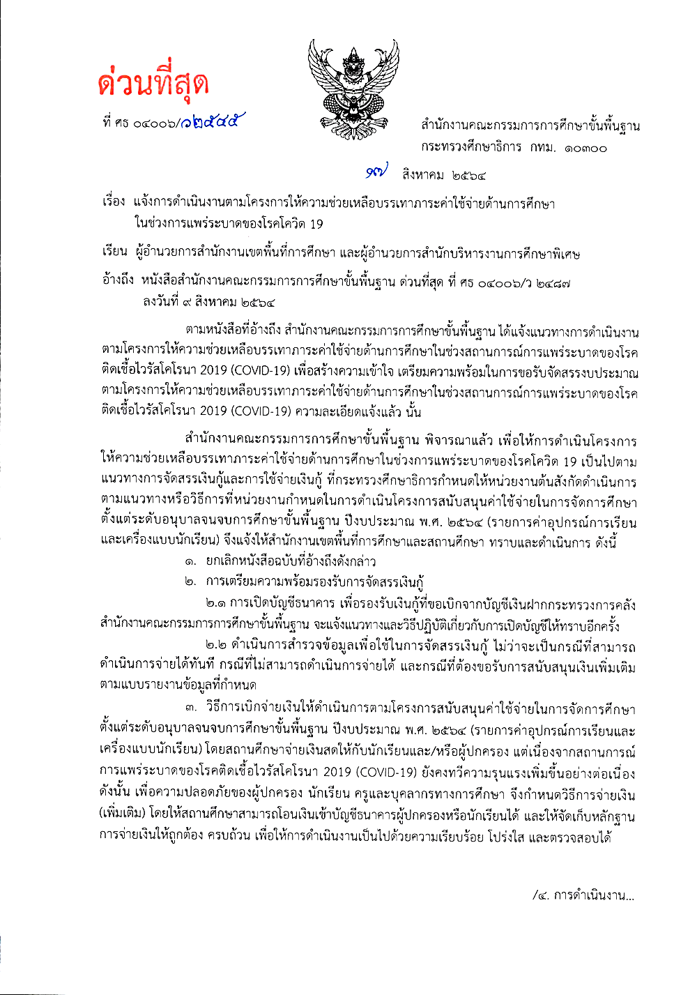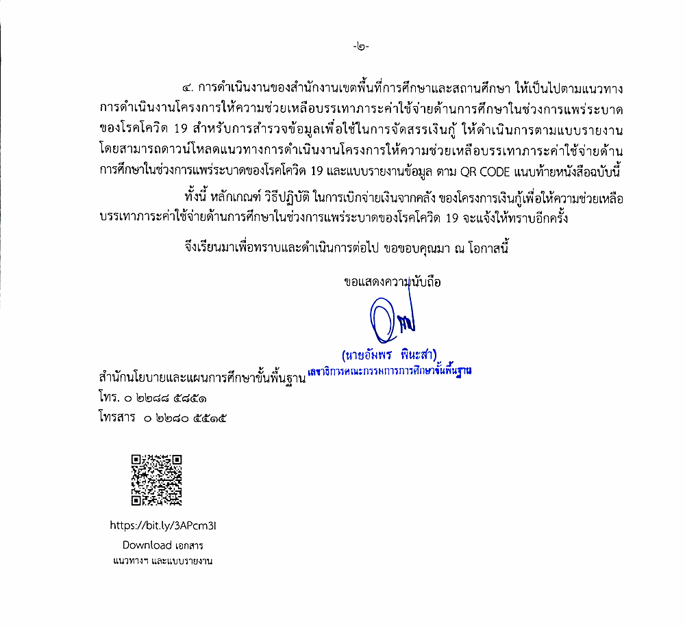 - เอกสารแนวทางการดำเนินงานโครงการให้ความช่วยเหลือบรรเทาภาระค่าใช้จ่ายด้านการศึกษา ในช่วงการแพร่ระบาดของโรคโควิด 19