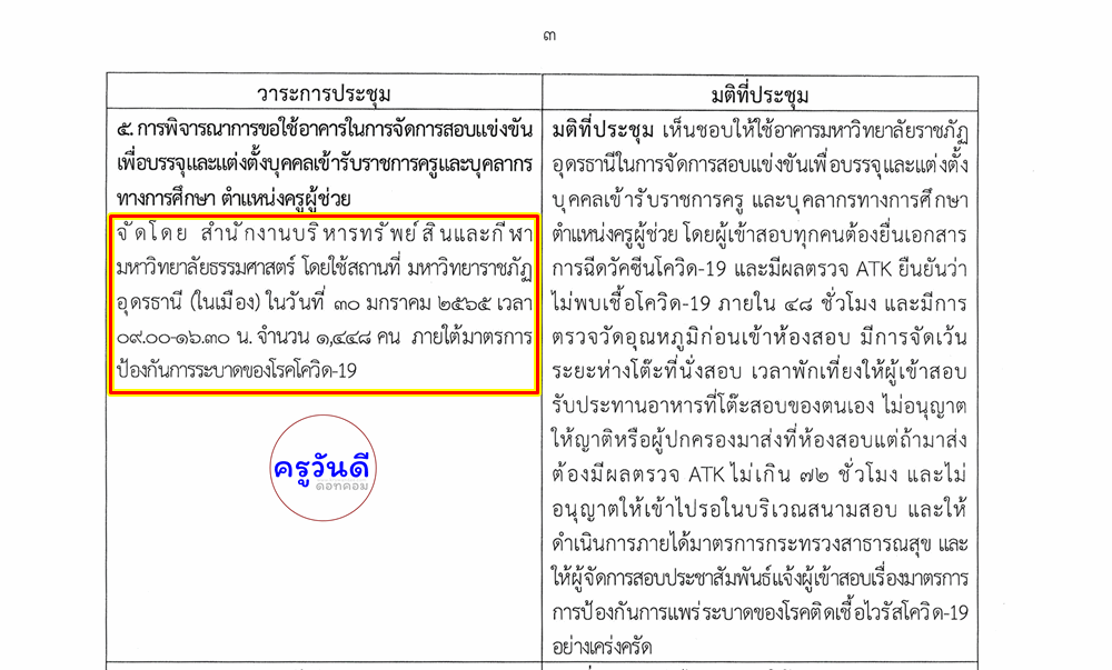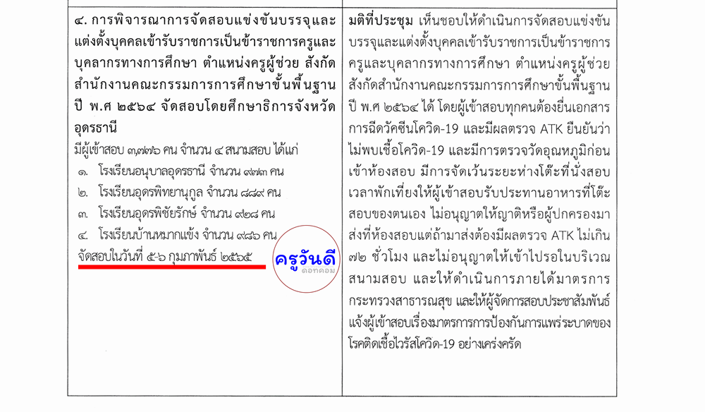 09 ธ.ค. 2568ประกาศรับสมัครคัดเลือก 'โครงการเพชรในตม' รุ่นที่ 41 ประจำปีการศึกษา 2569 (ความร่วมมือ กอ.รมน. และ มศว) เพื่อคัดเลือกเยาวชนเข้าศึกษาต่อและบรรจุเป็นข้าราชการครู 09 ธ.ค. 2568สพป.สุราษฎร์ธานี เขต 2 เรียกบรรจุครูผู้ช่วย 3 อัตรา (อังกฤษ/ประถม/ไทย) รายงานตัว 18 ธ.ค. 68 09 ธ.ค. 2568สพป.สกลนคร เขต 1 อนุมัติให้เขตอื่นใช้บัญชีครูผู้ช่วย 26 อัตรา (นครพนม/กาฬสินธุ์/มัธยมสกลฯ) 09 ธ.ค. 2568สนข. รับสมัครสอบแข่งขันบรรจุเป็นข้าราชการ ตำแหน่งนักวิเคราะห์นโยบายและแผน 3 อัตรา เงินเดือน 21,180 - 23,300 บาท 09 ธ.ค. 2568โรงเรียนอนุบาลเพชรบูรณ์ รับสมัครเจ้าหน้าที่การเงิน วุฒิป.ตรี (การเงิน/บัญชี) เงินเดือน 9,000 บาท 08 ธ.ค. 2568กรมบัญชีกลาง แจ้งเวียนหนังสือด่วนที่สุด ที่ กค (กวจ) 0405.2/ว 877 เรื่อง ซ้อมความเข้าใจงานจ้างเหมาบริการ (บุคคลธรรมดา) ตาม พ.ร.บ. การจัดซื้อจัดจ้างฯ 08 ธ.ค. 2568โรงเรียนนวมินทราชินูทิศ เบญจมราชาลัย รับสมัครลูกจ้างชั่วคราว 5 อัตรา (ครู/นักจิตวิทยา/ขับรถ/ช่าง) 08 ธ.ค. 2568สพป.กำแพงเพชร เขต 1 รับสมัครพนักงานราชการครู 7 อัตรา เงินเดือน 21,780 บาท 08 ธ.ค. 2568ด่วนที่สุด! ก.ค.ศ. สั่งเบรกย้ายครูผ่านระบบ TRS ชั่วคราว (เริ่ม 1 ม.ค. 69) ให้กลับไปใช้เกณฑ์ ว18 พร้อมสั่งเขตฯ ส่งปฏิทินย้ายด่วน ภายใน 19 ธ.ค.นี้! 08 ธ.ค. 2568โรงเรียนเพชรพิทยาคม รับสมัครลูกจ้างชั่วคราว 2 อัตรา (พัสดุ/ช่างโยธา) สมัคร 15-20 ธ.ค. 68