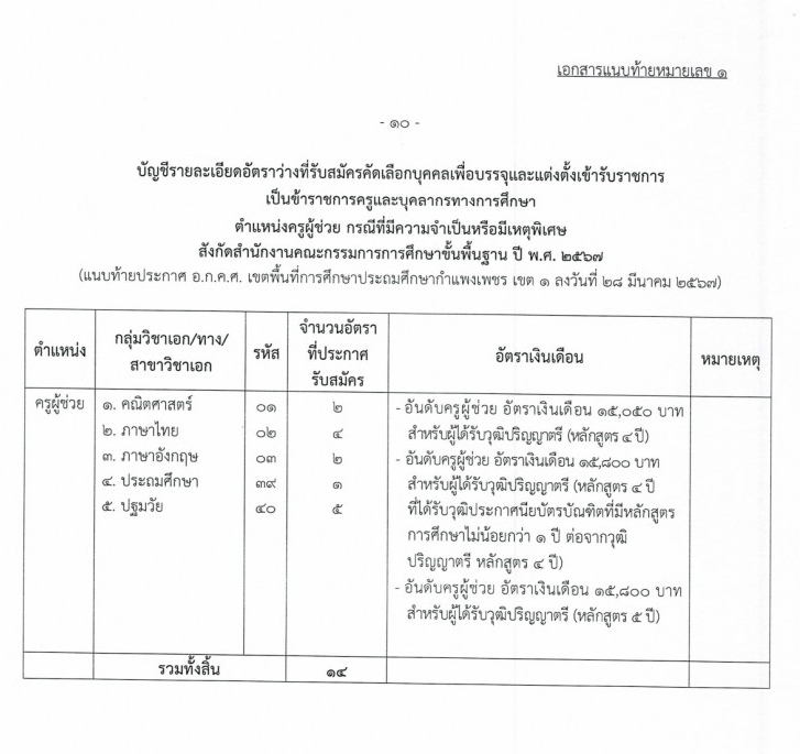 สพป.กำแพงเพชร เขต 1 รับสมัครสอบครูผู้ช่วย กรณีพิเศษ ปี พ.ศ.2567 จำนวน 14 อัตรา ตั้งแต่วันที่ 5-11 เม.ย.2567