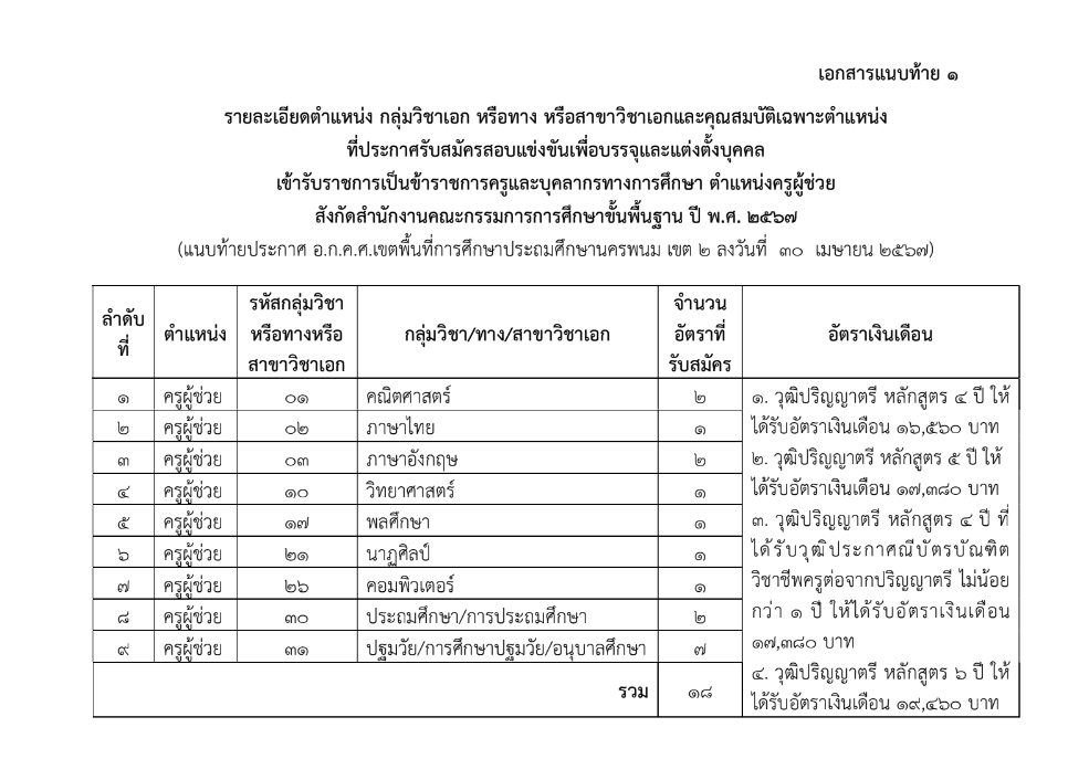 ตำแหน่งครูผู้ช่วย จำนวน 18 อัตรา ตามรายละเอียดกลุ่มวิชา หรือทาง หรือสาขาวิชาเอกที่เปิดรับสมัครสอบแข่งขันแนบท้ายประกาศนี้ (เอกสารแนบท้ายประกาศ 1)