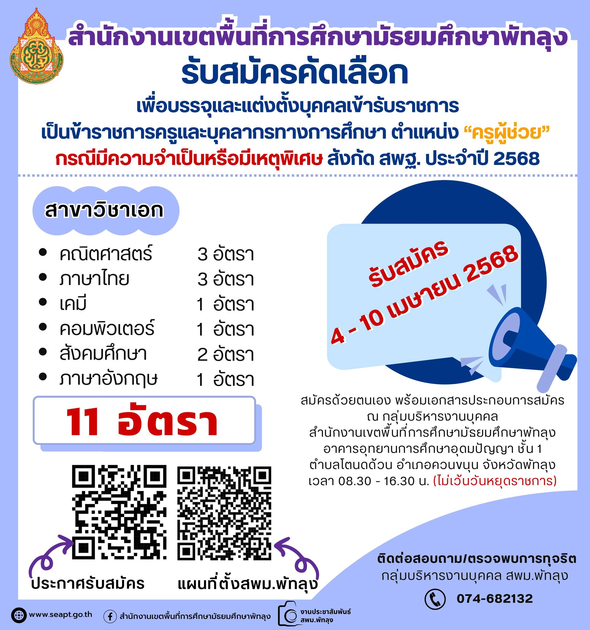 สพม.พัทลุง เปิดรับสมัครสอบครูผู้ช่วย กรณีพิเศษ ปี พ.ศ. 2568 จำนวน 11 อัตรา ตั้งแต่วันที่ 4-10 เมษายน 2568