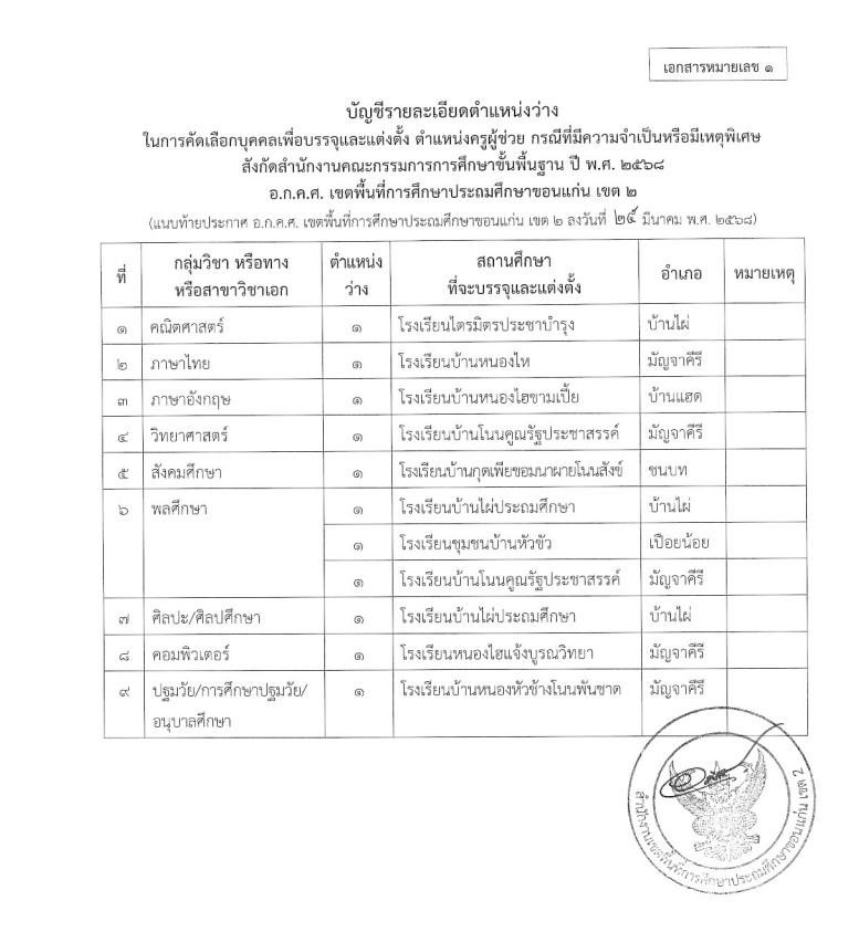 ด้วย อ.ก.ค.ศ. เขตพื้นที่การศึกษาประถมศึกษาขอนแก่น เขต 2 จะดำเนินการคัดเลือกบุคคลเพื่อบรรจุ และแต่งตั้งเข้ารับราชการเป็นข้าราชการครูและบุคลากรทางการศึกษา ตำแหน่งครูผู้ช่วย กรณีที่มีความจำเป็นหรือมีเหตุพิเศษ สังกัดสำนักงานคณะกรรมการการศึกษาขั้นพื้นฐาน ปี พ.ศ. 2568 โดยมีรายละเอียดดังต่อไปนี้