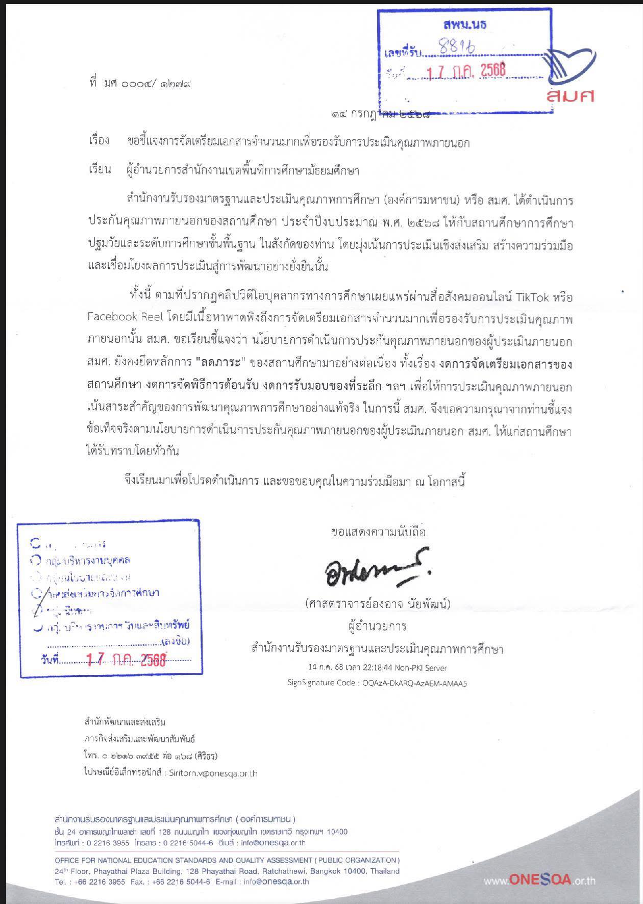 สำนักงานรับรองมาตรฐานและประเมินคุณภาพการศึกษา (องค์การมหาชน) หรือ สมศ. ได้ออกหนังสือ ที่ มศ 0004/1279 ลงวันที่ 14 กรกฎาคม 2568 เรื่อง “ขอชี้แจงการจัดเตรียมเอกสารจำนวนมากเพื่อรองรับการประเมินคุณภาพภายนอก” ถึงผู้อำนวยการสำนักงานเขตพื้นที่การศึกษามัธยมศึกษา