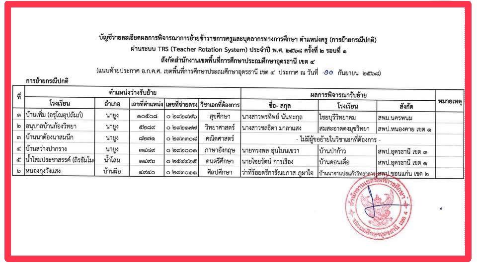 ด้วย อ.ก.ค.ศ. เขตพื้นที่การศึกษาประถมศึกษาอุดรธานี เขต 4 มีมติอนุมัติย้ายข้าราชการครูและบุคลากรทางการศึกษา ตำแหน่งครู ประจำปี พ.ศ. 2568 ครั้งที่ 2 ผ่านระบบ TRS (Teacher Rotation System) ตามคำร้องขอของตนเอง ไปดำรงตำแหน่งในสถานศึกษา สังกัดสำนักงานเขตพื้นที่การศึกษาประถมศึกษาอุดรธานี เขต 4 ดังรายละเอียดแนบท้ายประกาศนี้