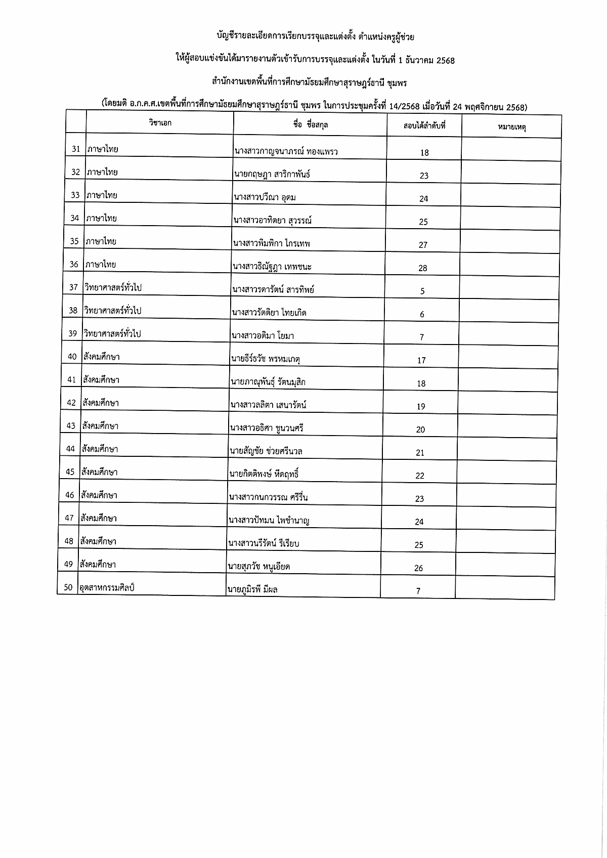 ทั้งนี้ รายชื่อผู้ได้รับการเรียกบรรจุและแต่งตั้ง ตลอดจนรายละเอียดเพิ่มเติมเกี่ยวกับการรายงานตัว สามารถตรวจสอบได้จากเอกสารประกาศฉบับเต็มของสำนักงานเขตพื้นที่การศึกษามัธยมศึกษาสุราษฎร์ธานี ชุมพร