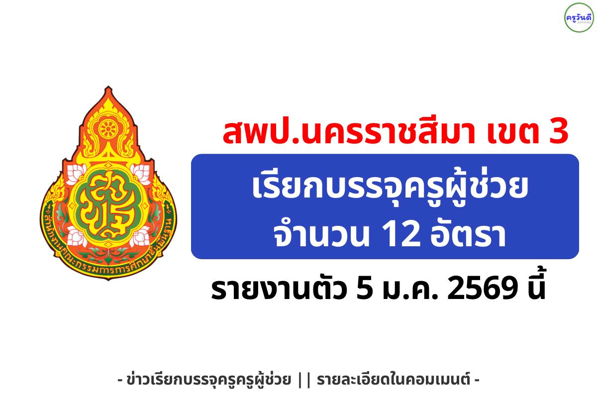 สำนักงานเขตพื้นที่การศึกษาประถมศึกษานครราชสีมา เขต 3 ประกาศเรียกบรรจุข้าราชการครูและบุคลากรทางการศึกษา "ตำแหน่งครูผู้ช่วย" จำนวนรวมทั้งสิ้น 12 อัตรา โดยเรียกบรรจุจากบัญชีผู้สอบแข่งขันได้ประจำปี พ.ศ. 2567 และ 2568 ครับ