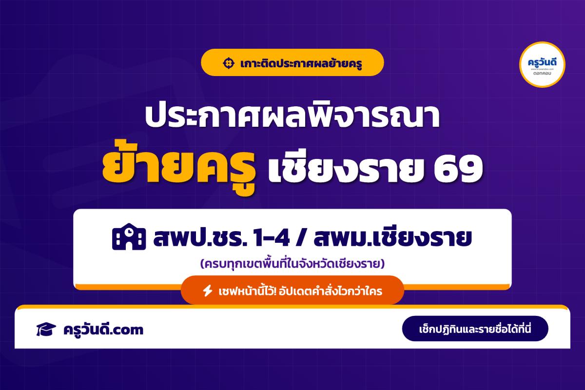 [ สรุปข่าว ] เพื่อนครูที่ขอย้ายเข้าจังหวัดเชียงรายเตรียมตัวครับ! แอดมินครูวันดีจัดทำหน้าเว็บไซต์นี้ขึ้นมาเพื่อเกาะติดสถานการณ์การประกาศผลพิจารณาย้ายข้าราชการครูและบุคลากรทางการศึกษา (กรณีปกติ) ประจำปี 2569 รอบที่ 1 ของ อ.ก.ค.ศ. เขตพื้นที่การศึกษาในจังหวัดเชียงราย ทันทีที่มีการประกาศผลอย่างเป็นทางการ แอดมินจะนำลิงก์มาอัปเดตให้ท่านตรวจสอบรายชื่อและดาวน์โหลดคำสั่งย้ายแบบแยกเขตพื้นที่ได้ที่นี่ทันทีครับ