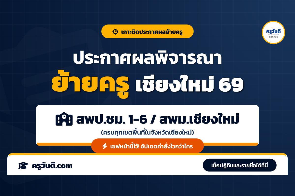 [ สรุปข่าว ] เพื่อนครูที่ขอย้ายเข้าจังหวัดเชียงใหม่เตรียมตัวครับ! แอดมินครูวันดีจัดทำหน้าเว็บไซต์นี้ขึ้นมาเพื่อเกาะติดสถานการณ์การประกาศผลพิจารณาย้ายข้าราชการครูและบุคลากรทางการศึกษา (กรณีปกติ) ประจำปี 2569 รอบที่ 1 ของ อ.ก.ค.ศ. เขตพื้นที่การศึกษาในจังหวัดเชียงใหม่ ทันทีที่มีการประกาศผลอย่างเป็นทางการ แอดมินจะนำลิงก์มาอัปเดตให้ท่านตรวจสอบรายชื่อและดาวน์โหลดคำสั่งย้ายแบบแยกเขตพื้นที่ได้ที่นี่ทันทีครับ