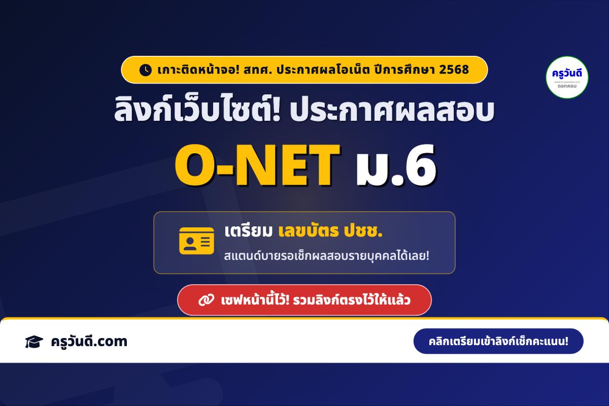 สวัสดีครับน้อง ๆ ม.6 ผู้ปกครอง และคุณครูทุกท่าน! เตรียมตัวนอนดึกกันนิดนึงนะครับ เพราะ แอดมินครูวันดี กำลังเกาะติดหน้าเว็บไซต์ สถาบันทดสอบทางการศึกษาแห่งชาติ (สทศ.) อย่างใกล้ชิด เพื่อรอลุ้นการประกาศผลสอบโอเน็ต (O-NET) ระดับชั้นมัธยมศึกษาปีที่ 6 ประจำปีการศึกษา 2568 (สอบเมื่อต้นปี 2569) คาดว่าระบบอาจจะเปิดให้เช็กคะแนนรายบุคคลได้ในช่วงกลางดึกคืน วันที่ 24 มีนาคม 2569 นี้เลยครับ แอดมินจึงรวบรวมลิงก์ทางเข้าทั้งหมดมาให้สแตนด์บายรอไว้แล้วครับ!