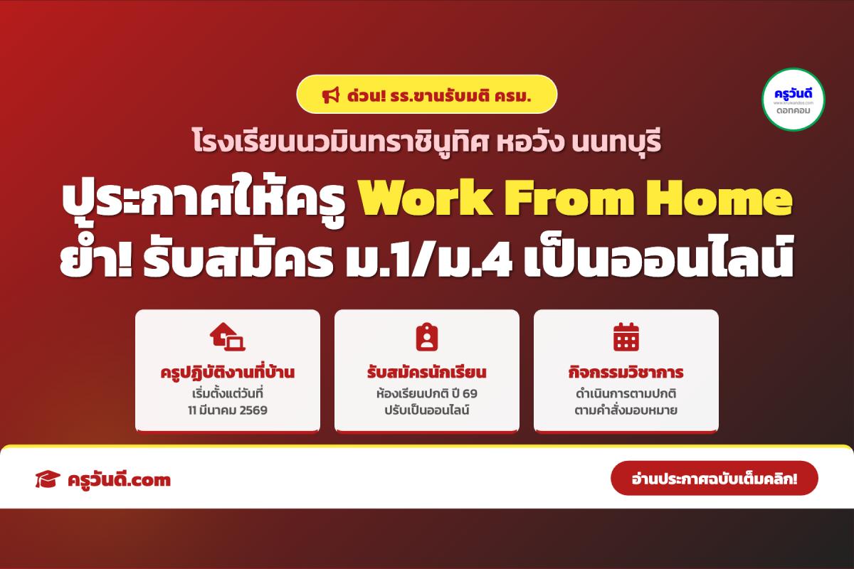 สวัสดีครับเพื่อนครู! แอดมินครูวันดี นำข่าวสารการตอบรับนโยบายรัฐบาลที่รวดเร็วมาฝากกันอย่างต่อเนื่องครับ ภายหลังคณะรัฐมนตรีมีมติให้หน่วยงานราชการดำเนินมาตรการ Work From Home ล่าสุด โรงเรียนนวมินทราชินูทิศ หอวัง นนทบุรี ได้ออกประกาศกำหนดแนวปฏิบัติให้บุคลากร WFH ทันที เพื่อประหยัดพลังงาน พร้อมแจ้งข่าวสำคัญถึงผู้ปกครองเรื่องการรับสมัครนักเรียนด้วยครับ!
