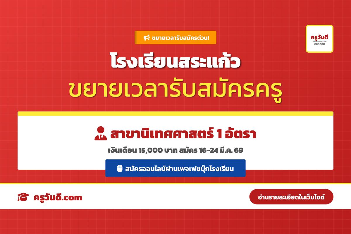 โรงเรียนสระแก้ว ขยายเวลารับสมัครครูอัตราจ้าง สาขานิเทศศาสตร์ 1 อัตรา เงินเดือน 15,000 บาท