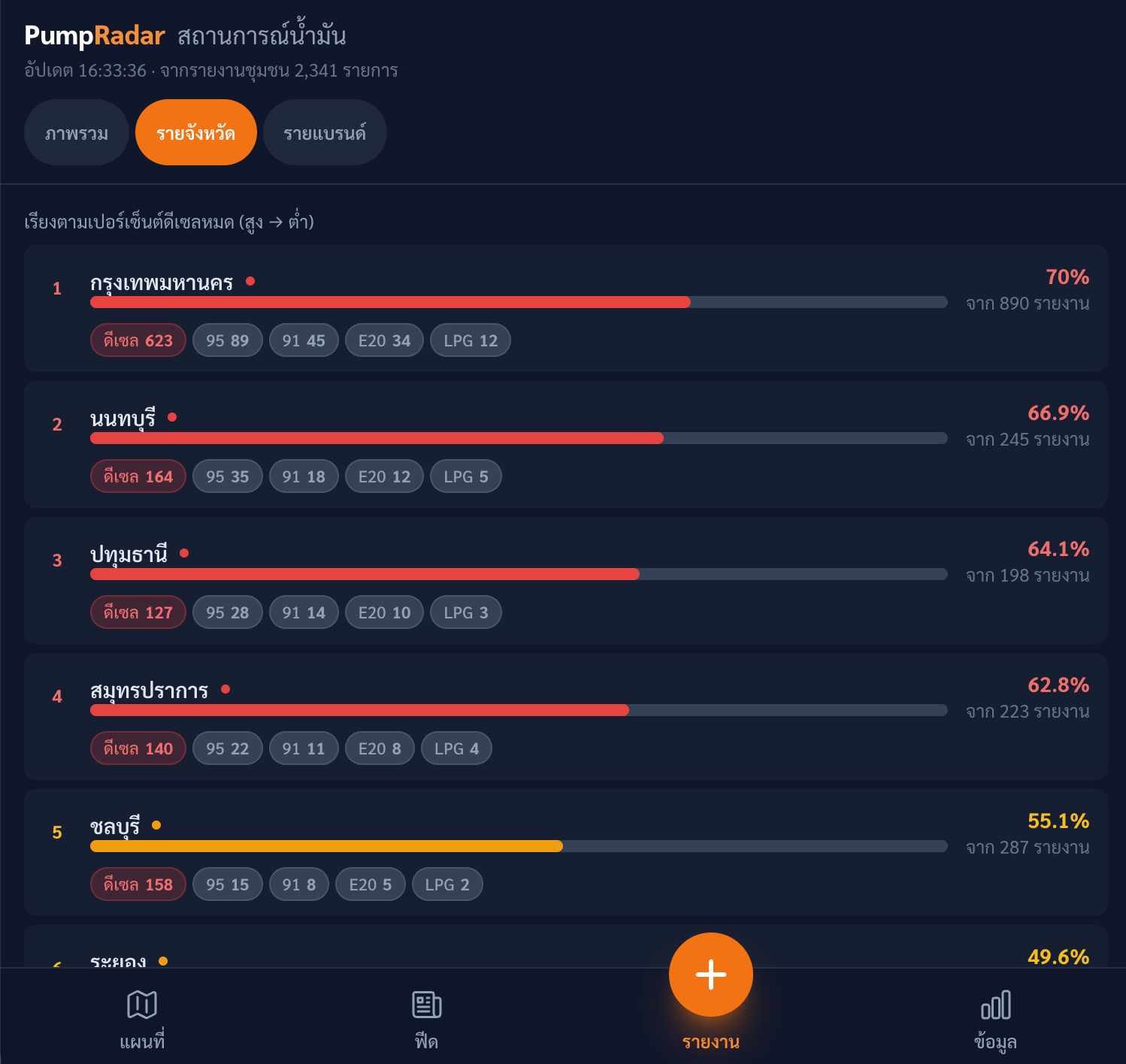- เช็กสถานะน้ำมัน: ตรวจสอบได้ว่าปั๊มไหนยังมีน้ำมัน หรือปั๊มไหนหมดแล้ว โดยกรองตามประเภทน้ำมัน (ดีเซล, เบนซิน 91, เบนซิน 95, E20, E85, LPG) และแบรนด์ปั๊ม (ปตท., บางจาก, PT, Shell, Esso ฯลฯ)
