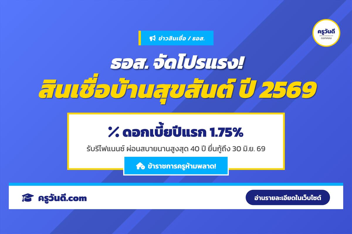 สรุปข่าวสินเชื่อและสวัสดิการ: ข่าวดีสำหรับข้าราชการครูและผู้ที่ต้องการรีไฟแนนซ์บ้าน ธนาคารอาคารสงเคราะห์ (ธอส.) ได้ออกผลิตภัณฑ์ "สินเชื่อบ้านสุขสันต์ ปี 2569" ชูจุดเด่นอัตราดอกเบี้ยปีแรกเพียง 1.75% ต่อปี พร้อมให้ระยะเวลาผ่อนชำระยาวนานสูงสุดถึง 40 ปี โดยเปิดรับคำขอกู้ตั้งแต่วันนี้ จนถึงวันที่ 30 มิถุนายน 2569 ครับ