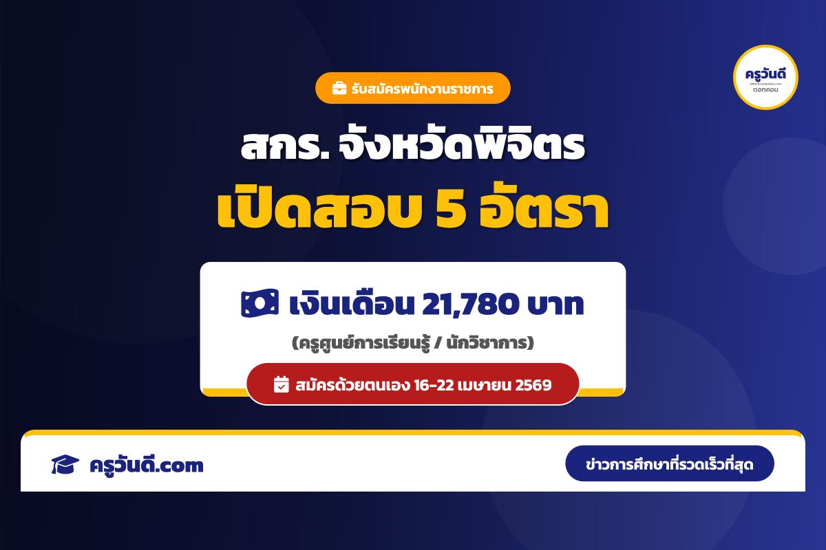 สรุปข่าวรับสมัครงาน: ประกาศสำนักงานส่งเสริมการเรียนรู้ประจำจังหวัดพิจิตร เรื่อง รับสมัครบุคคลเพื่อสรรหาและเลือกสรรเป็นพนักงานราชการทั่วไป ประจำปี 2569 ในตำแหน่งครูศูนย์การเรียนรู้ และตำแหน่งนักวิชาการ รวมจำนวน 5 อัตรา อัตราเงินเดือน 21,780 บาท โดยเปิดรับสมัครด้วยตนเอง ตั้งแต่วันที่ 16 - 22 เมษายน 2569 ครับ