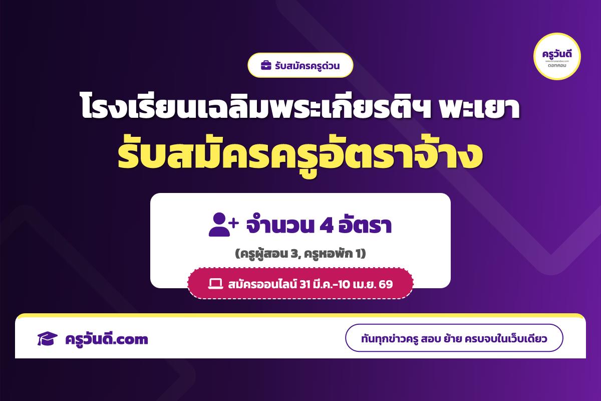 สรุปข่าวประกาศรับสมัคร: โรงเรียนเฉลิมพระเกียรติสมเด็จพระศรีนครินทร์ พะเยา เปิดรับสมัครบุคคลเพื่อสอบคัดเลือกเป็นลูกจ้างชั่วคราว ตำแหน่งครูผู้สอนและครูดูแลนักเรียนประจำพักนอน จำนวน 4 อัตรา โดยสามารถยื่นใบสมัครด้วยตนเอง หรือส่งทางอีเมลได้ตั้งแต่วันที่ 31 มีนาคม - 10 เมษายน 2569 ครับ