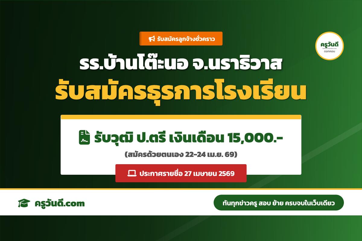 โรงเรียนบ้านโต๊ะนอ จ.นราธิวาส รับสมัครลูกจ้าง ตำแหน่งธุรการโรงเรียน วุฒิ ป.ตรี (22-24 เม.ย. 69)