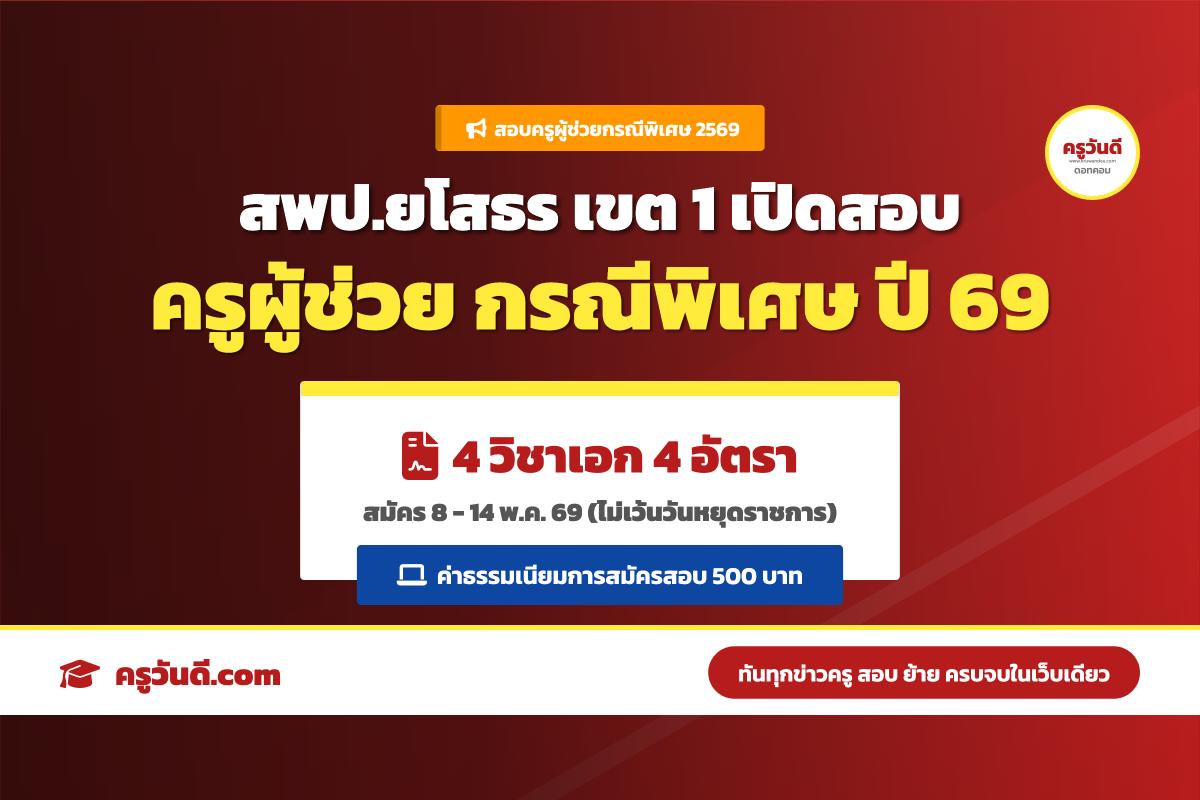 ด่วน! สพป.ยโสธร เขต 1 เปิดสอบครูผู้ช่วยกรณีพิเศษ ปี พ.ศ. 2569 จำนวน 4 อัตรา 4 วิชาเอก