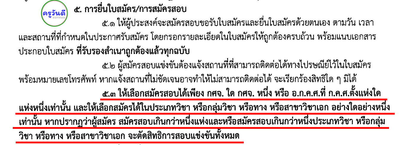 5.3 ให้เลือกสมัครสอบได้เพียง กศจ. ใด กศจ. หนึ่ง หรือ อ.ก.ค.ศ.ที่ ก.ค.ศ.ตั้งแห่งใดแห่งหนึ่งเท่านั้น และให้เลือกสมัครได้ในประเภทวิชา หรือกลุ่มวิชา หรือทาง หรือสาขาวิชาเอก อย่างใดอย่างหนึ่งเท่านั้น หากปรากฏว่าผู้สมัคร สมัครสอบเกินกว่าหนึ่งแห่งและหรือสมัครสอบเกินกว่าหนึ่งประเภทวิชา หรือกลุ่มวิชา หรือทาง หรือสาขาวิชาเอก จะตัดสิทธิการสอบแข่งขันทั้งหมด