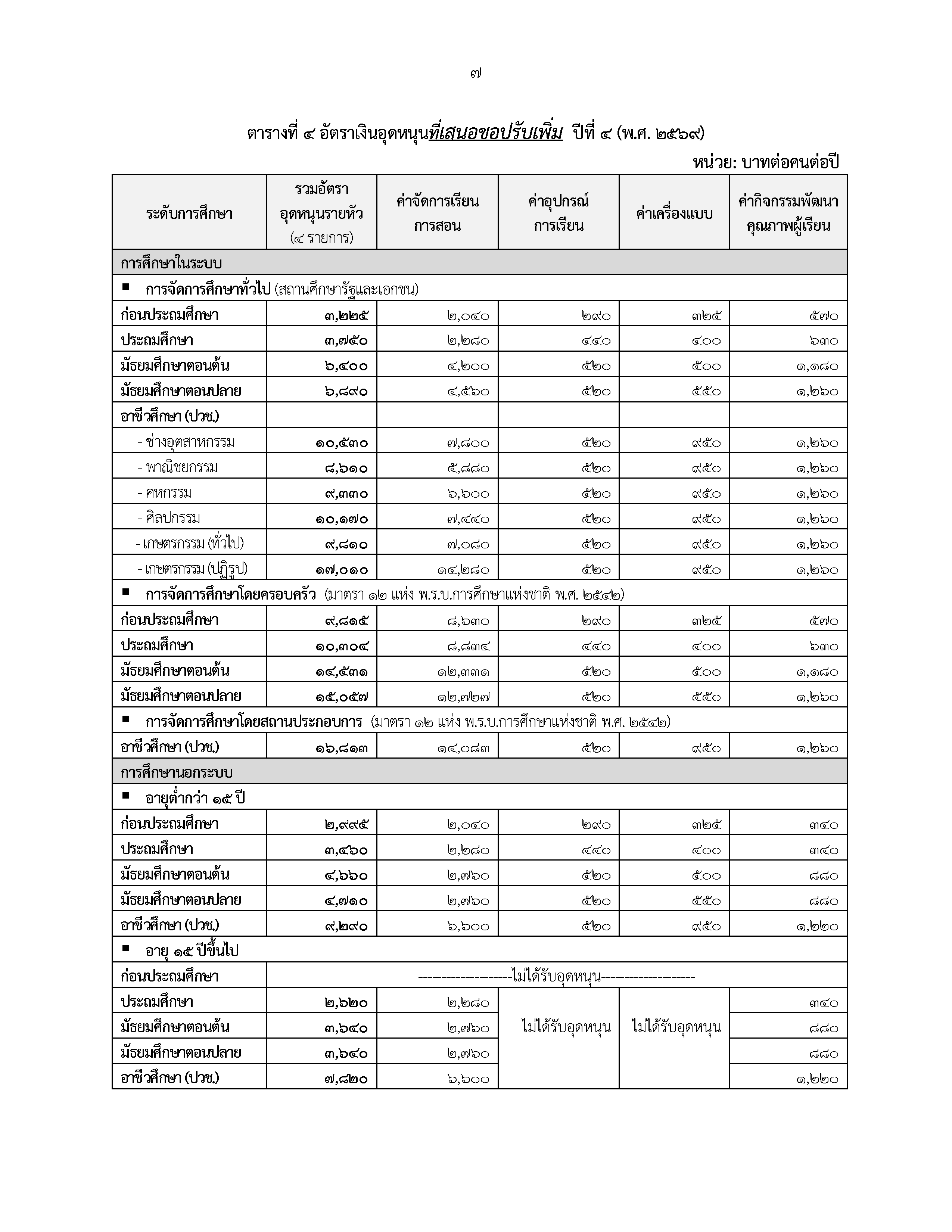 ข้อเสนอปรับเพิ่ม : ปรับเพิ่มจากอัตราปัจจุบัน โดยปรับให้ผู้เรียนการศึกษาในระบบทุกคนและการศึกษานอกระบบอายุต่ำกว่า 15 ปี (ผู้ที่อยู่ในวัยเรียน) ดังนี้