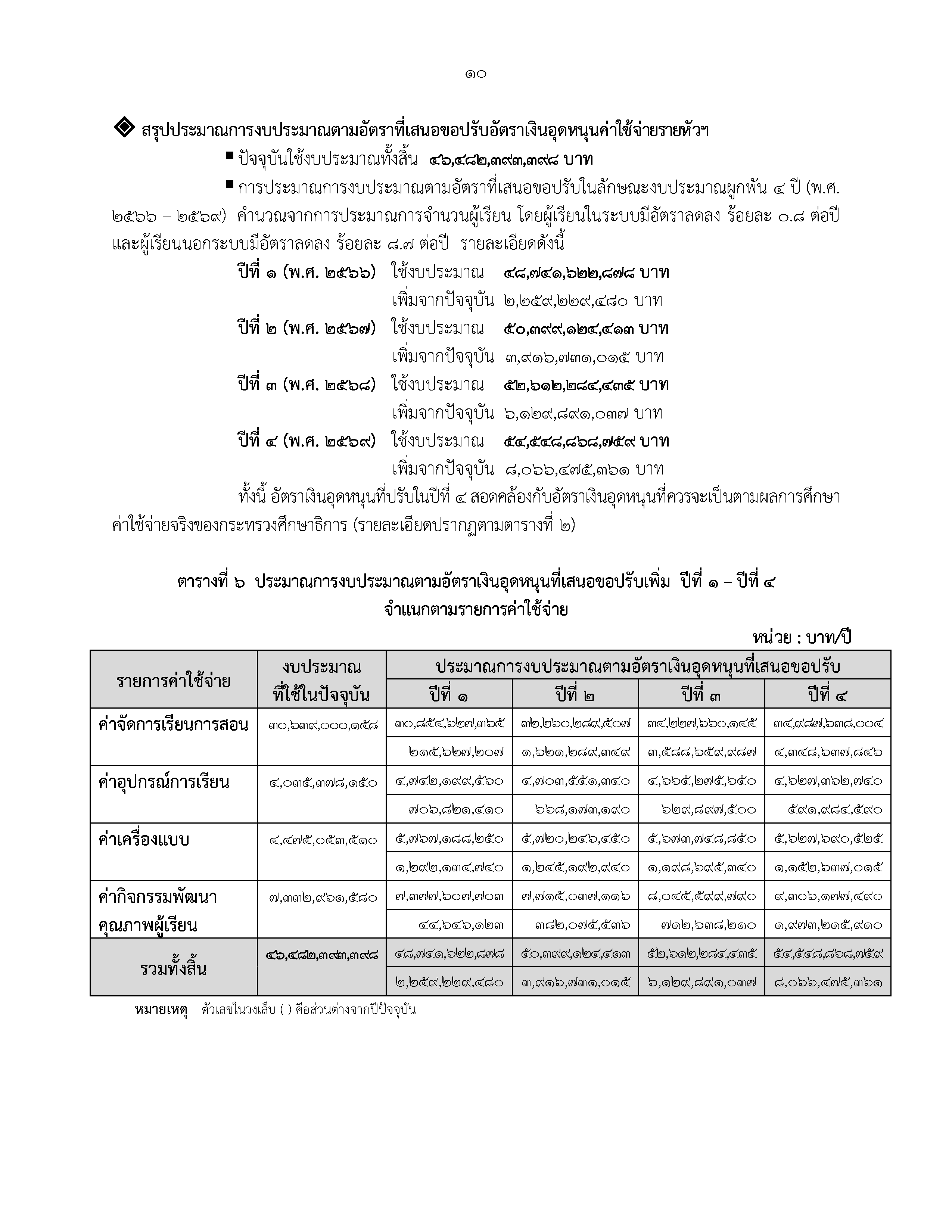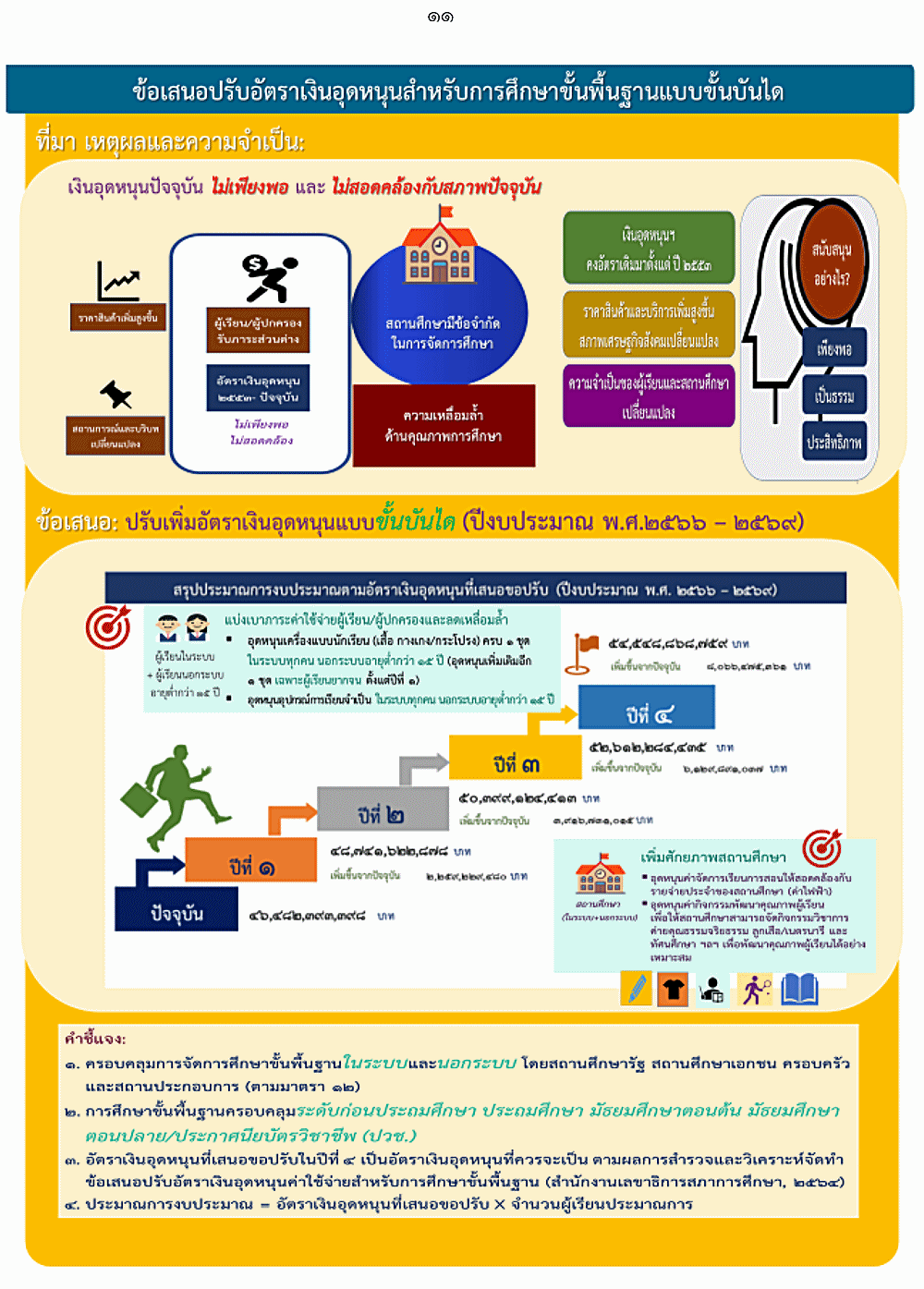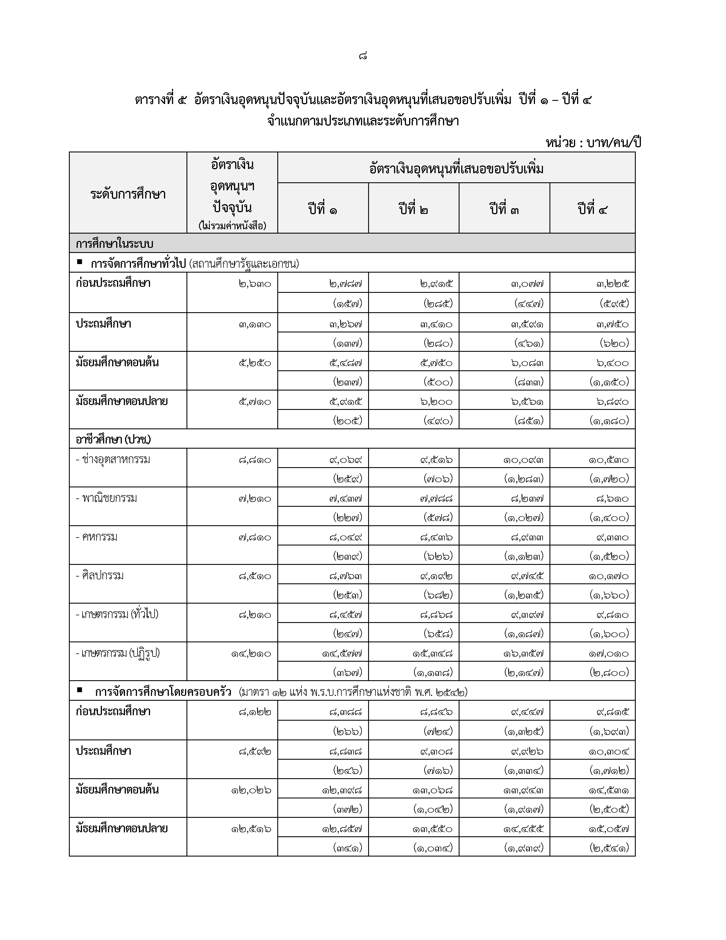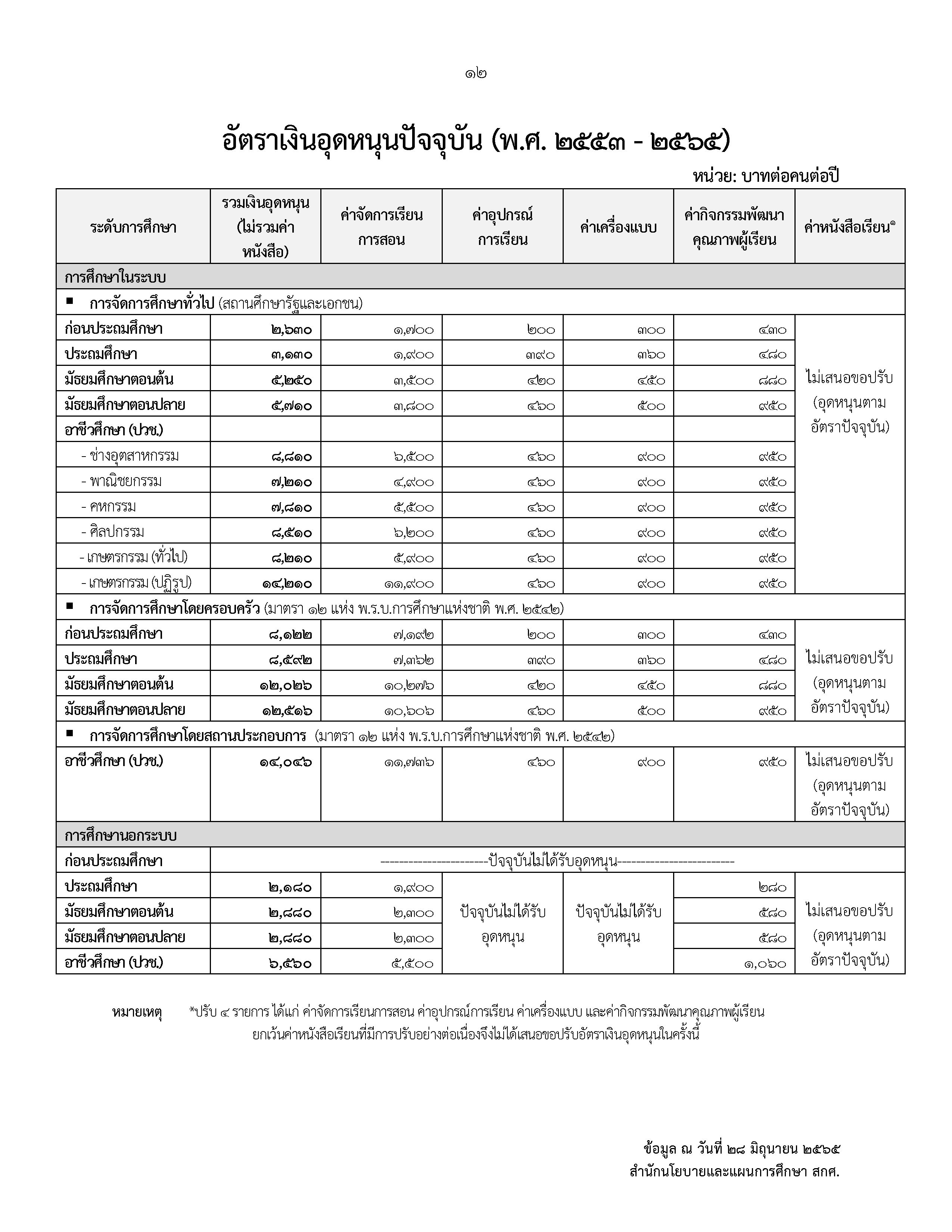 ข้อเสนอปรับเพิ่ม : ปรับเพิ่มจากอัตราปัจจุบัน โดยปรับให้ผู้เรียนการศึกษาในระบบและการศึกษานอกระบบ ระดับการศึกษาขั้นพื้นฐานทุกคน ดังนี้