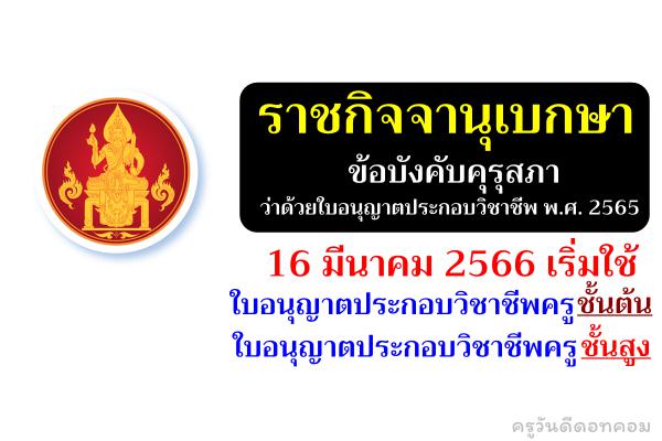 ราชกิจจานุเบกษา เมื่อวันที่ 15 ธันวาคม 2565 เผยแพร่ข้อบังคับคุรุสภา ว่าด้วยใบอนุญาตประกอบวิชาชีพ พ.ศ. 2565 ซึ่งยกเลิกข้อบังคับฯ ฉบับเดิม ปี พ.ศ. 2559 และที่แก้ไขพิ่มเติม (ฉบับที่ 2) พ.ศ. 2562 เพื่อให้เหมาะสมและสอดคล้องกับการประกอบวิชาชีพทางการศึกษาในปัจจุบัน ให้ใช้บังคับเมื่อพ้นกำหนด 90 วัน นับแต่วันประกาศในราชกิจจานุเบกษาเป็นต้นไป