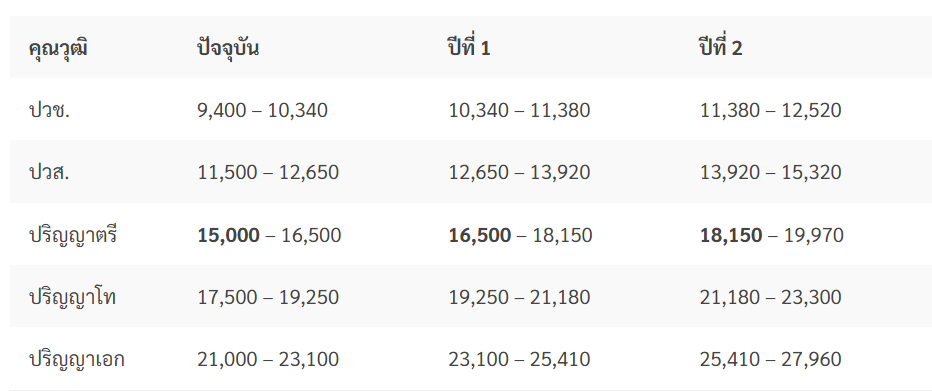 (1) การปรับอัตราเงินเดือนแรกบรรจุ โดยทยอยปรับอัตราเงินเดือนแรกบรรจุตามคุณวุฒิเพิ่มขึ้น (ทุกคุณวุฒิ) และแตกต่างกันตามระดับคุณวุฒิการศึกษา ภายใน 2 ปี โดยมีเป้าหมายการปรับอัตราเงินเดือนแรกบรรจุตามคุณวุฒิการศึกษา (คุณวุฒิหลัก) ดังนี้