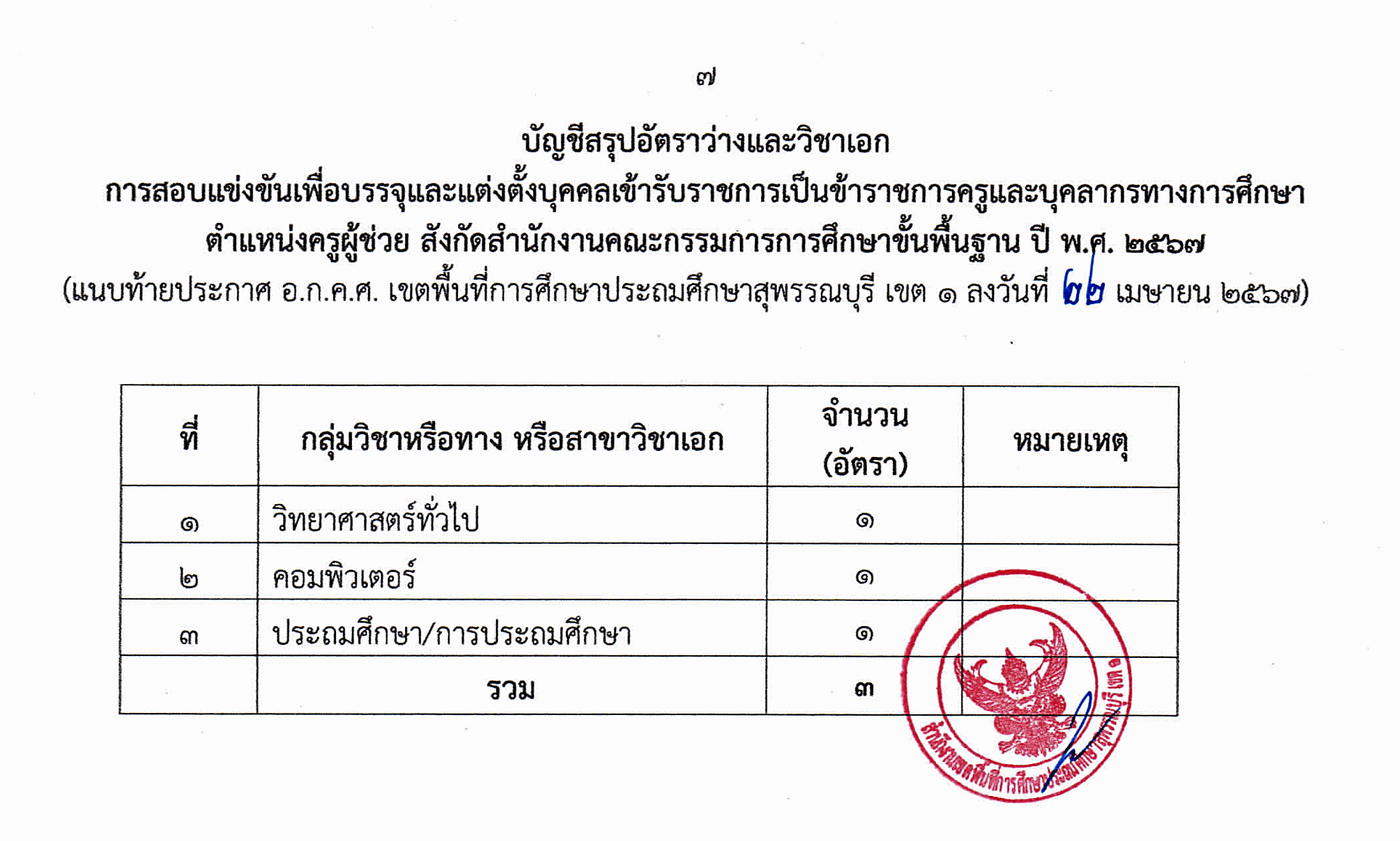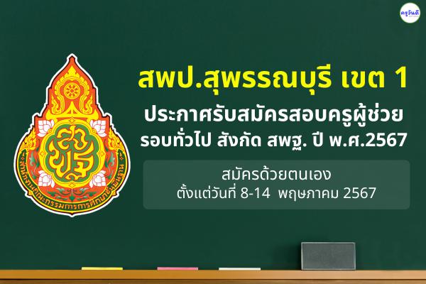 ด้วย อ.ก.ค.ศ. เขตพื้นที่การศึกษาประถมศึกษาสุพรรณบุรี เขต 1 จะดำเนินการสอบแข่งขันเพื่อบรรจุและแต่งตั้งบุคคลเข้ารับราชการเป็นข้าราชการครูและบุคลากรทางการศึกษา ตำแหน่งครูผู้ช่วย สังกัดสำนักงานคณะกรรมการการศึกษาขั้นพื้นฐาน ปี พ.ศ. 2567 ประกอบกับพระราชบัญญัติแก้ไขเพิ่มเติมคำสั่งหัวหน้าคณะรักษาความสงบแห่งชาติ ที่ 19/2560 เรื่องการปฏิรูปการศึกษาในภูมิภาคของกระทรวงศึกษาธิการ ลงวันที่ 3 เมษายน พุทธศักราช 2560 พ.ศ. 2565 หนังสือสำนักงาน ก.ค.ศ. ด่วนที่สุด ที่ ศธ 0206.9/ว 32 ลงวันที่ 15 พฤศจิกายน 2565 หนังสือสำนักงาน ก.ค.ศ. ที่ ศธ 0206.6/ว 14 ลงวันที่ 1 พฤษภาคม 2566 หนังสือสำนักงาน ก.ค.ศ. ที่ ศธ 0206.6/ว 2 ลงวันที่ 5 มกราคม 2567 หนังสือสำนักงาน ก.ค.ศ. ที่ ศธ 0206.6/37 ลงวันที่ 16 มกราคม 2567 หนังสือสำนักงาน ก.ค.ศ. ที่ ศ5 1206.7/ว 8 ลงวันที่ 1 เมษายน 2567 หนังสือสำนักงานคณะกรรมการการศึกษาขั้นพื้นฐาน ที่ ศธ 04009/ว 2508 ลงวันที่ 18 เมษายน 2567 และโดยมติ อ.ก.ค.ศ. เขตพื้นที่การศึกษาประถมศึกษาสุพรรณบุรี เขต 1 ในการประชุมฯ จึงประกาศรับสมัครสอบแข่งขันเพื่อบรรจุและแต่งตั้งบุคคลเข้ารับราชการเป็นข้าราชการครูและบุคลากรทางการศึกษา ตำแหน่งครูผู้ช่วย สังกัดสำนักงานคณะกรรมการการศึกษาขั้นพื้นฐาน ปี พ.ศ. 2567 โดยมีรายละเอียด ดังต่อไปนี้
