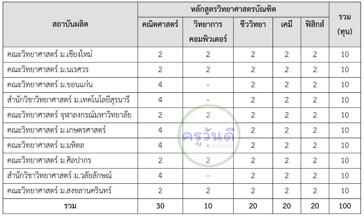 ทุนโครงการ สควค. ระยะที่ 4 ประเภท 1 ระดับปริญญาตรี-โท กำหนดให้ศึกษาหลักสูตรปกติในประเทศ รวมระยะเวลาให้ทุนการศึกษาไม่เกิน 6 ปี ประกอบด้วยทุนระดับปริญญาตรี 4 ปี และระดับปริญญาโท 2 ปี โดยในปีการศึกษา 2568 มีทุนจัดสรร จำนวน 100 ทุน จำแนกตามสถาบันผลิต หลักสูตร และสาขาวิชา ดังนี้