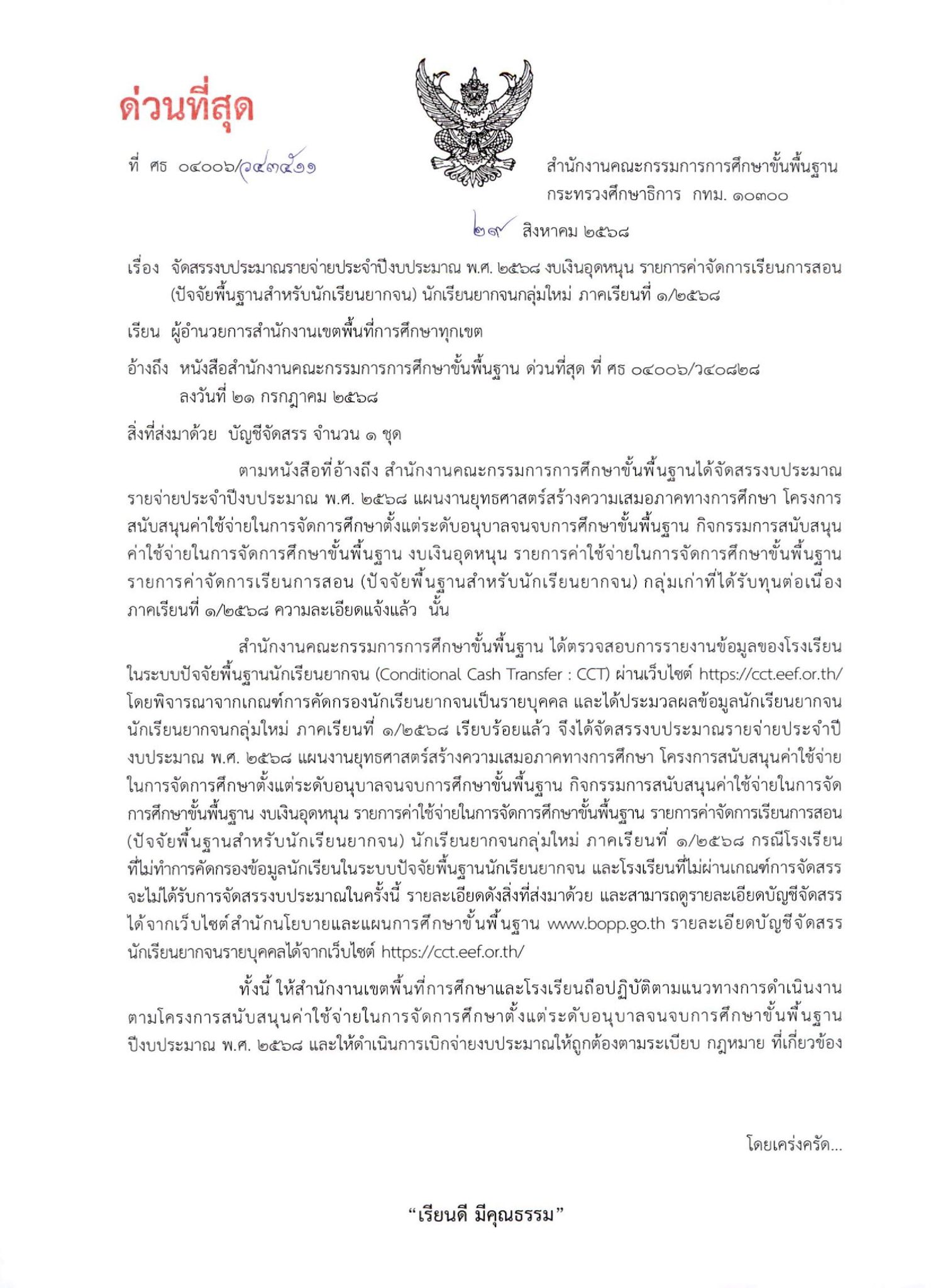สพฐ., งบประมาณ 2568, ปัจจัยพื้นฐานนักเรียนยากจน, ค่าจัดการเรียนการสอน, นักเรียนยากจนกลุ่มใหม่, ภาคเรียนที่ 1/2568, งบเงินอุดหนุน, บัญชีจัดสรรรายเขต, บัญชีจัดสรรรายโรงเรียน, บัญชีจัดสรรรายหน่วยเบิก, โรงเรียนที่ไม่ได้รับจัดสรร, หน่วยเบิกที่ไม่ได้รับจัดสรร, CCT, ฐานข้อมูลนักเรียนยากจน, กสศ., สำนักงานคณะกรรมการการศึกษาขั้นพื้นฐาน, สำนักนโยบายและแผนการศึกษาขั้นพื้นฐาน, โอนเงินนักเรียนยากจน