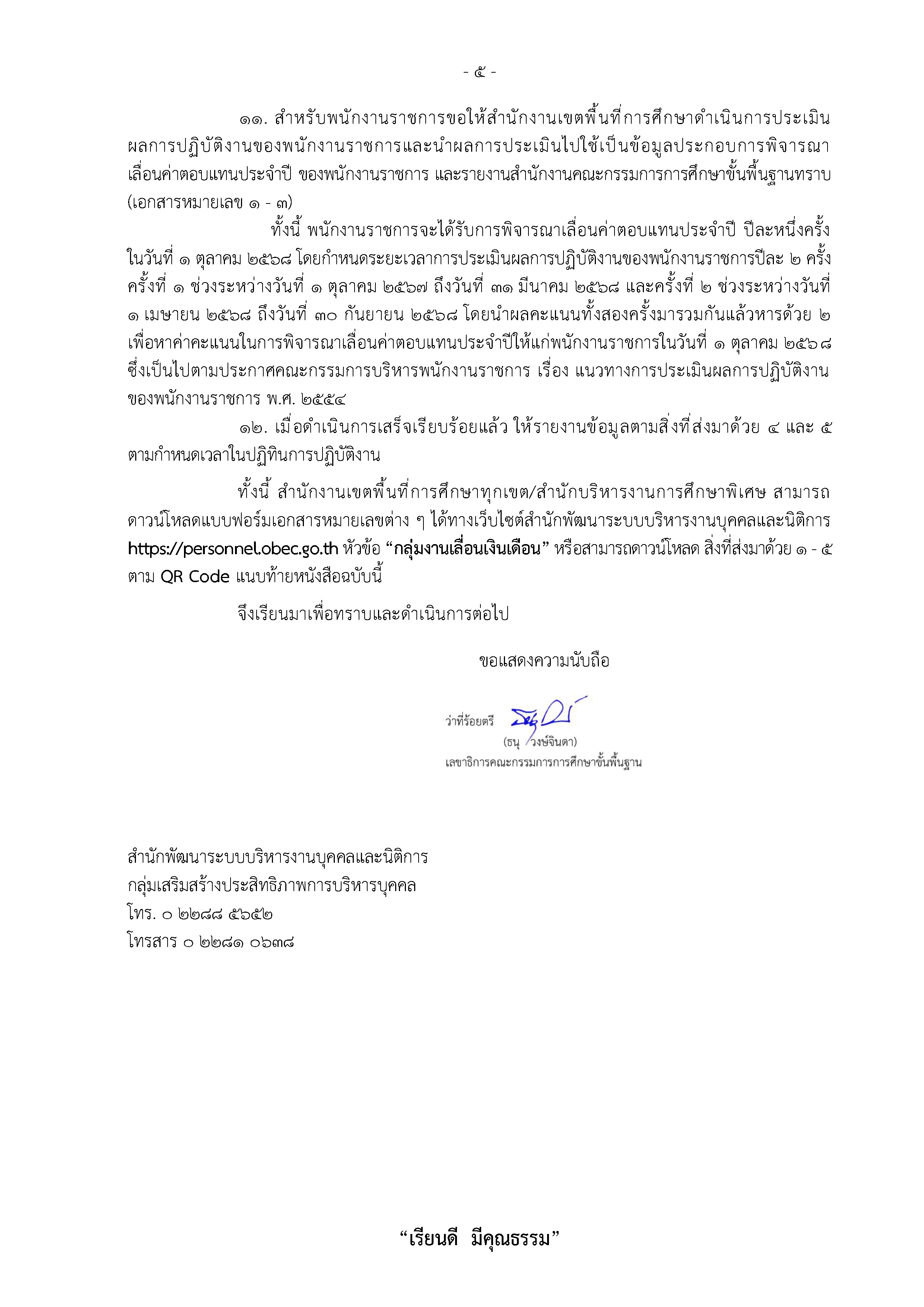 สำนักงานคณะกรรมการการศึกษาขั้นพื้นฐาน (สพฐ.) ออกหนังสือด่วนที่สุด ที่ ศธ 04009/ว42869 ลงวันที่ 20 สิงหาคม 2568 เรื่อง ซักซ้อมการเลื่อนเงินเดือนข้าราชการ การเลื่อนขั้นค่าจ้างลูกจ้างประจำ และการเลื่อนค่าตอบแทนพนักงานราชการ ครั้งที่ 2 เพื่อให้หน่วยงานในสังกัดดำเนินการตามปฏิทินงานอย่างเคร่งครัด โดยมีผลตั้งแต่วันที่ 1 ตุลาคม 2568 และได้จัดส่งเอกสารแนบครบชุดประกอบแนวทางปฏิบัติ