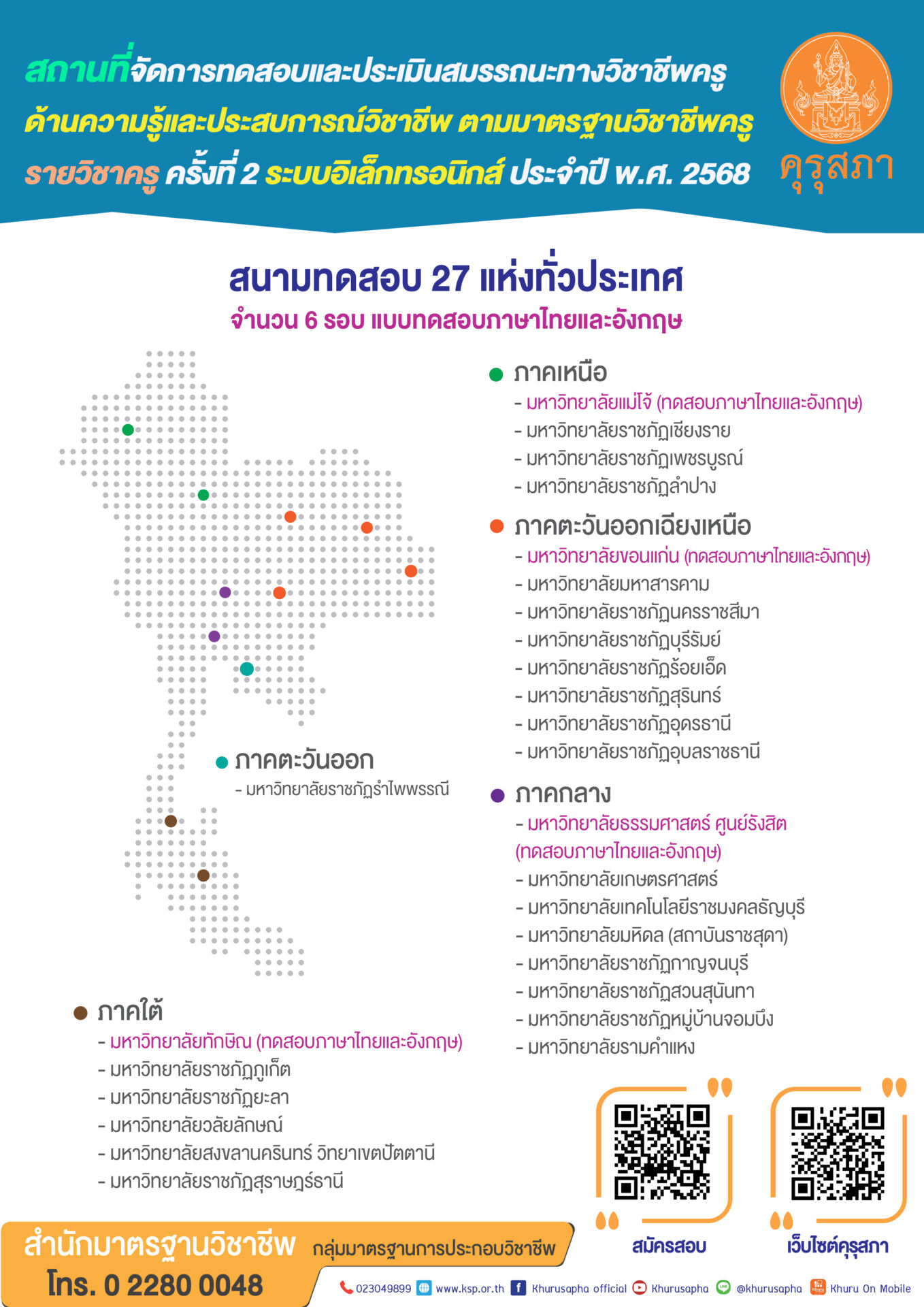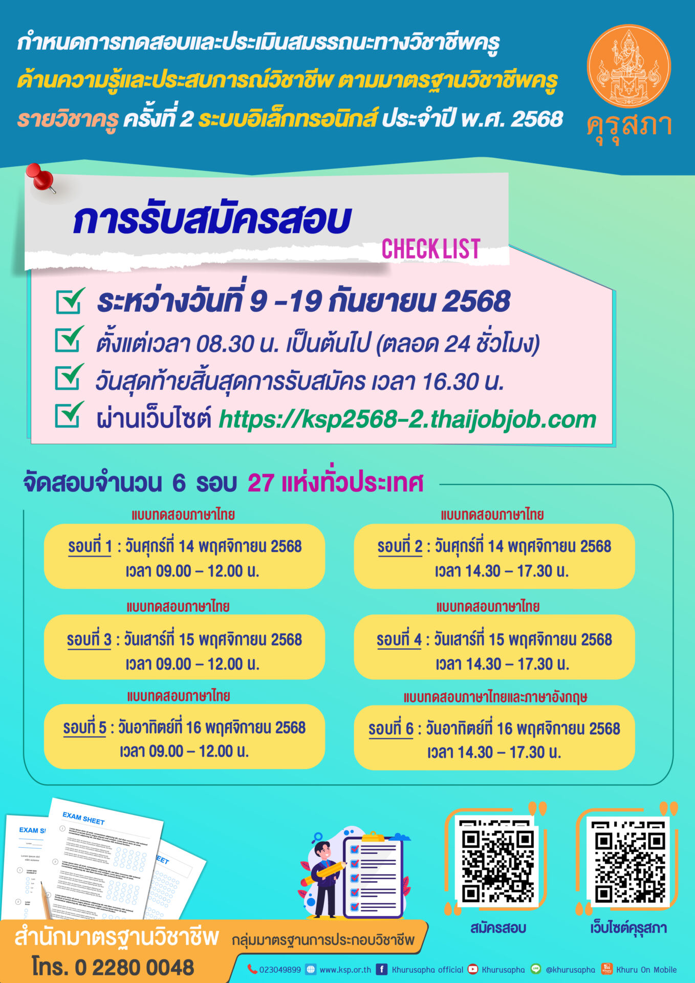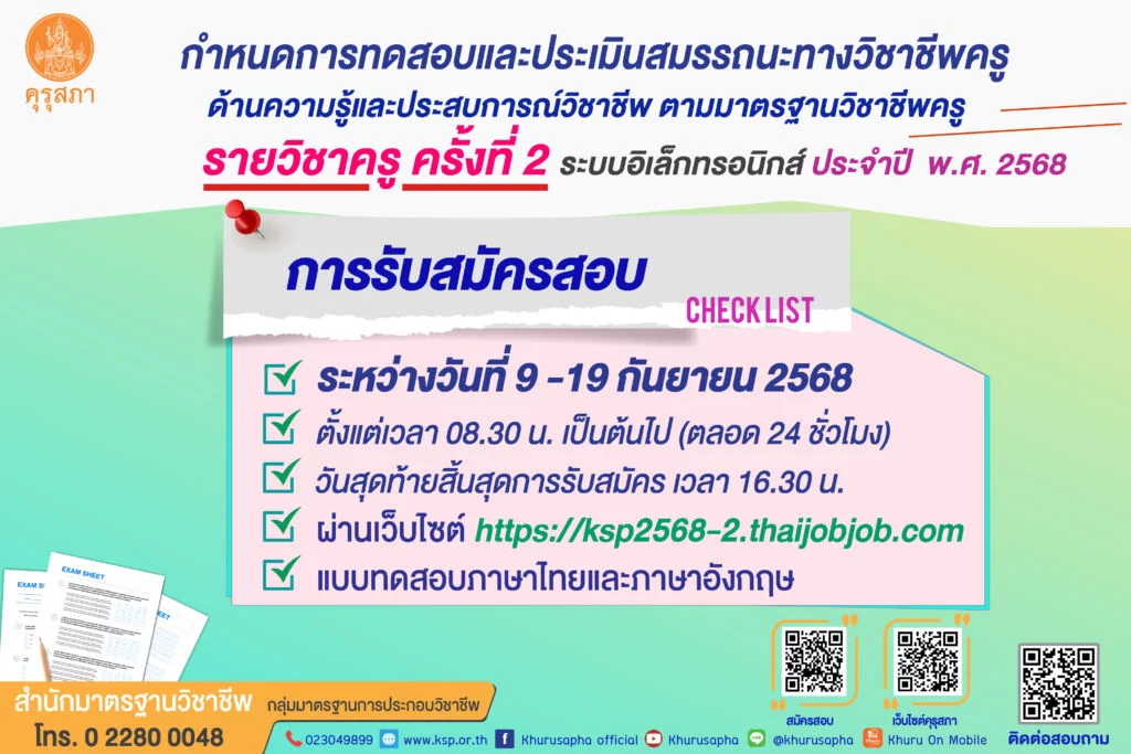 คุรุสภาเปิดรับสมัครการเข้ารับการทดสอบและประเมินสมรรถนะทางวิชาชีพครู ด้านความรู้และประสบการณ์วิชาชีพ ตามมาตรฐานวิชาชีพครู รายวิชาครู ครั้งที่ 2 ประจำปี พ.ศ. 2568 ผ่านระบบอิเล็กทรอนิกส์ ผู้สนใจสมัครได้ผ่าน เว็บไซต์รับสมัคร ตามลิงก์ด้านล่าง โดยมีแบบทดสอบทั้งภาษาไทยและภาษาอังกฤษ