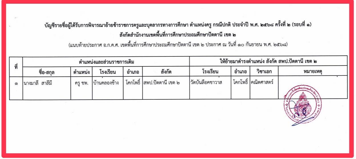 ด้วย อ.ก.ค.ศ. เขตพื้นที่การศึกษาประถมศึกษาปัตตานี เขต 2 มีมติอนุมัติย้ายข้าราชการครูและบุคลากรทางการศึกษา ตำแหน่งครู ประจำปี พ.ศ. 2568 ครั้งที่ 2 ผ่านระบบ TRS (Teacher Rotation System) ตามคำร้องขอของตนเอง ไปดำรงตำแหน่งในสถานศึกษา สังกัดสำนักงานเขตพื้นที่การศึกษาประถมศึกษาปัตตานี เขต 2 ดังรายละเอียดแนบท้ายประกาศนี้