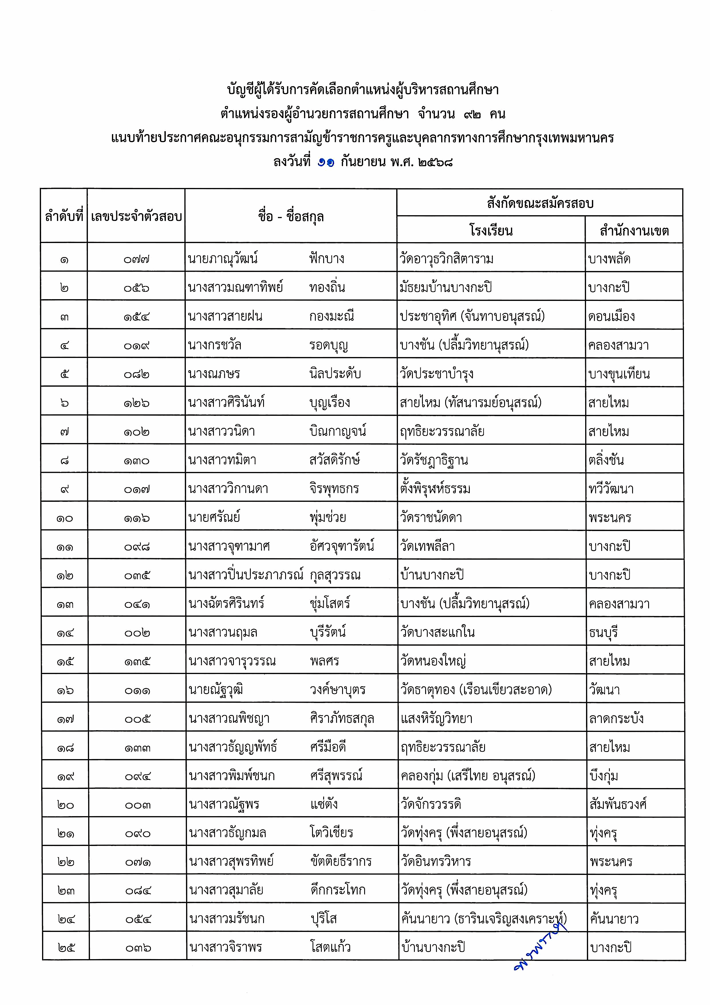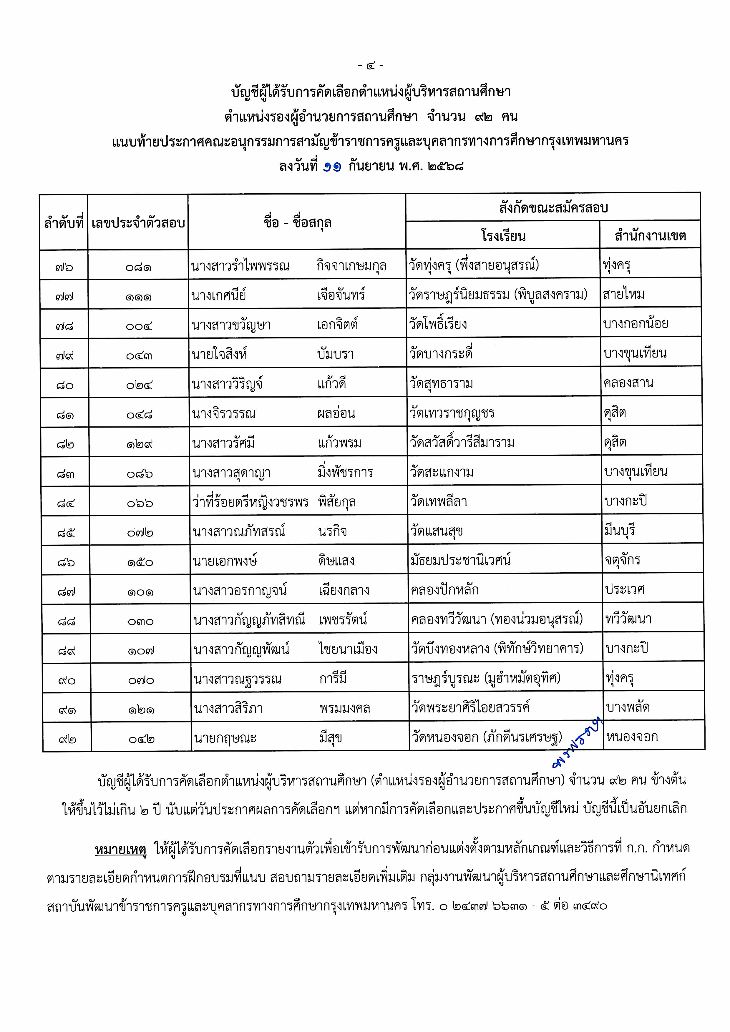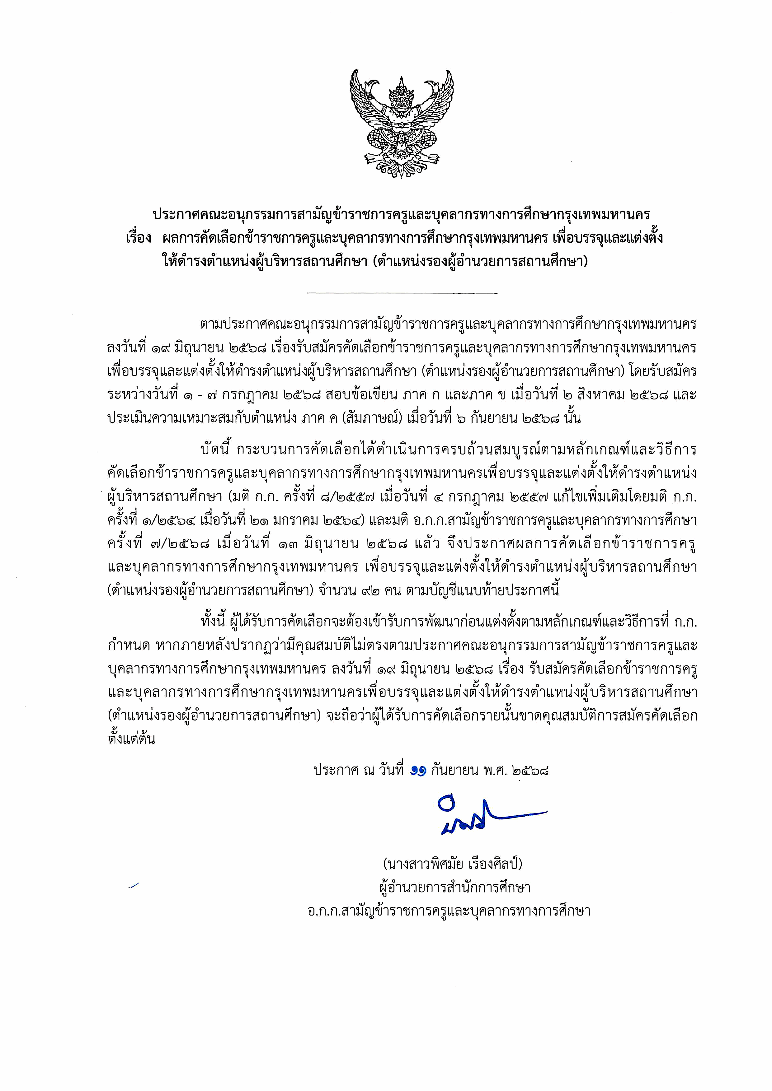 - แจ้งผลการคัดเลือกข้าราชการครูและบุคลากรทางการศึกษา กรุงเทพมหานคร สำหรับตำแหน่งรองผู้อำนวยการสถานศึกษา