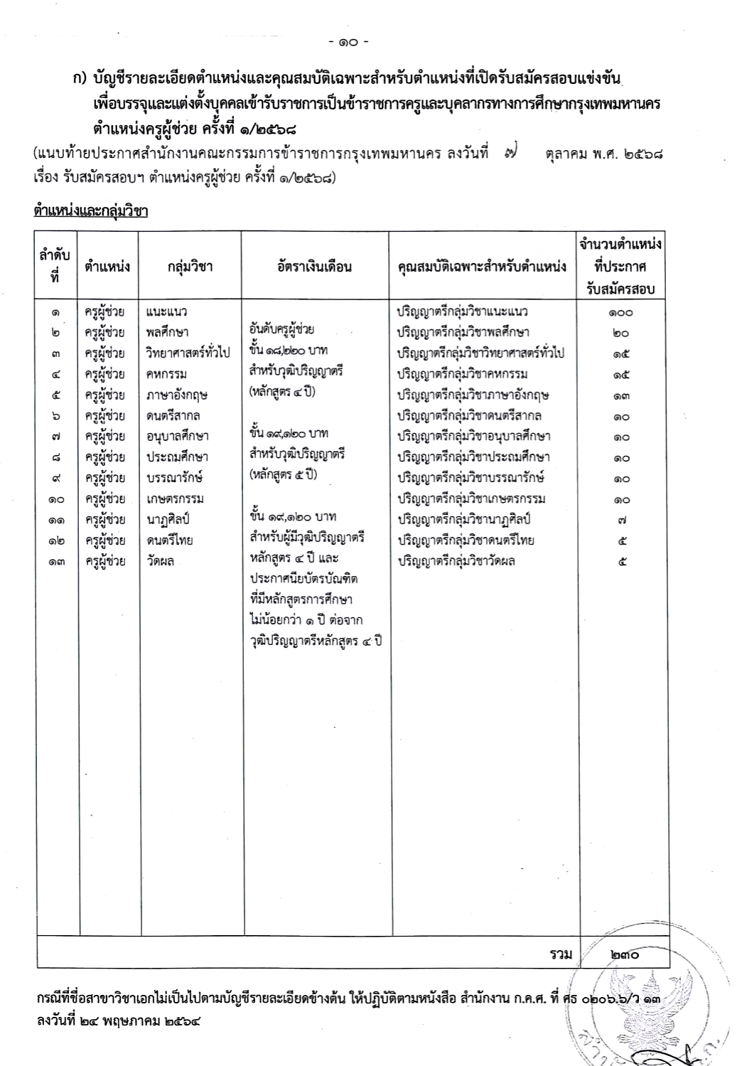 กรุงเทพมหานคร เปิดรับสมัครสอบแข่งขันเพื่อบรรจุและแต่งตั้งบุคคลเข้ารับราชการเป็นข้าราชการครูและบุคลากรทางการศึกษากรุงเทพมหานคร ตำแหน่ง “ครูผู้ช่วย” ครั้งที่ 1/2568 รวมจำนวนทั้งสิ้น 230 อัตรา ตามประกาศสำนักงานคณะกรรมการข้าราชการกรุงเทพมหานคร ลงวันที่ 17 ตุลาคม 2568