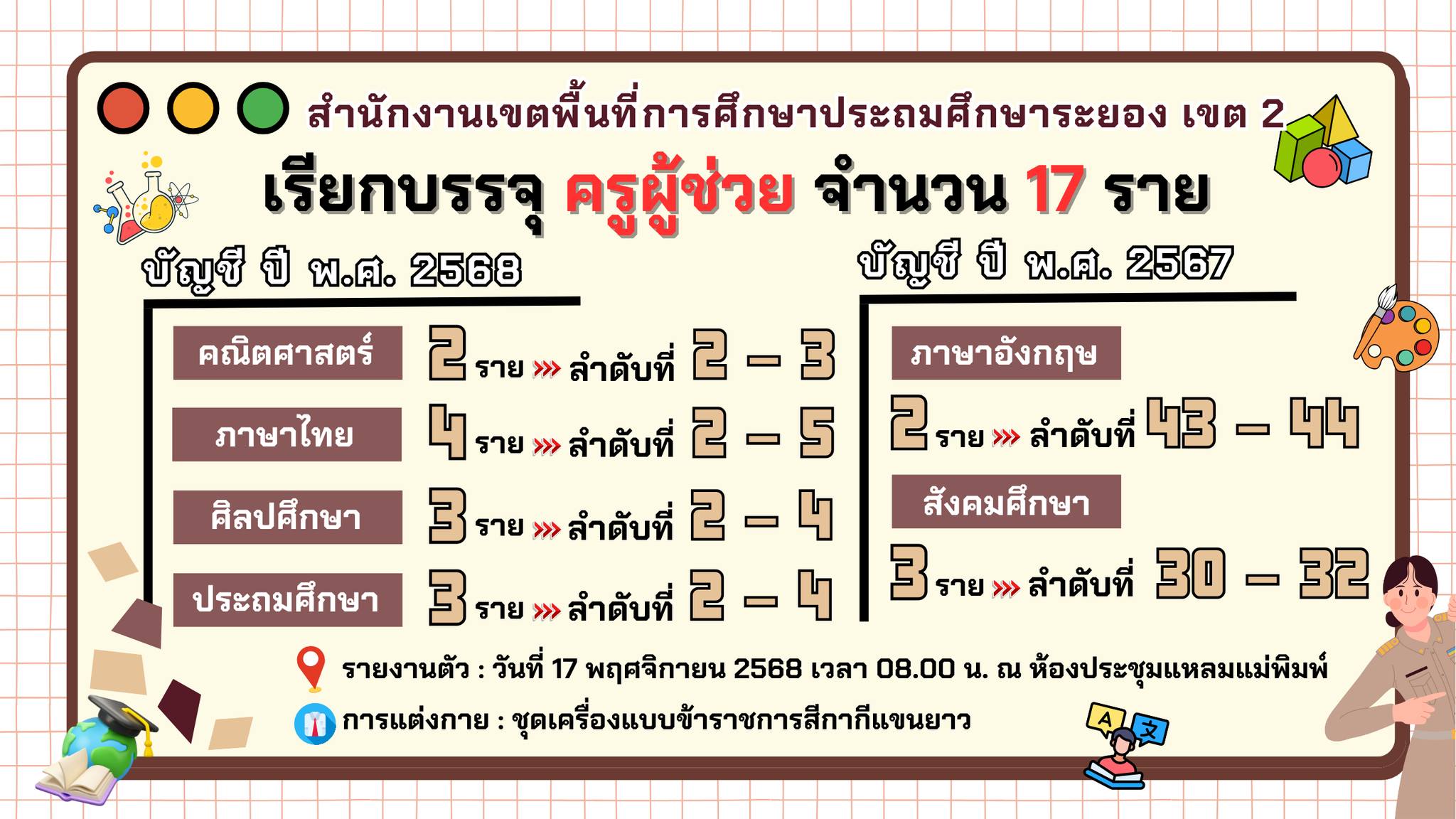 สำนักงานเขตพื้นที่การศึกษาประถมศึกษาระยอง เขต 2 ประกาศเรียกบรรจุและแต่งตั้งครูผู้ช่วย รวมจำนวน 17 อัตรา จากบัญชีผู้สอบแข่งขันได้ ปี พ.ศ. 2568 และ ปี พ.ศ. 2567 ตามรายละเอียดต่อไปนี้