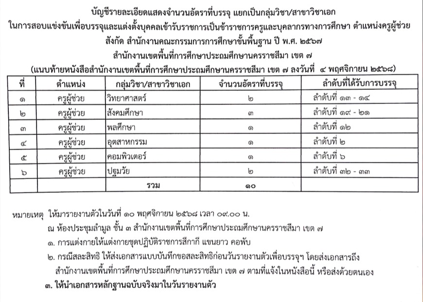 สพป.นครราชสีมา เขต 7 เรียกบรรจุครูผู้ช่วย 10 อัตรา - รายงานตัว 10 พ.ย. 2568