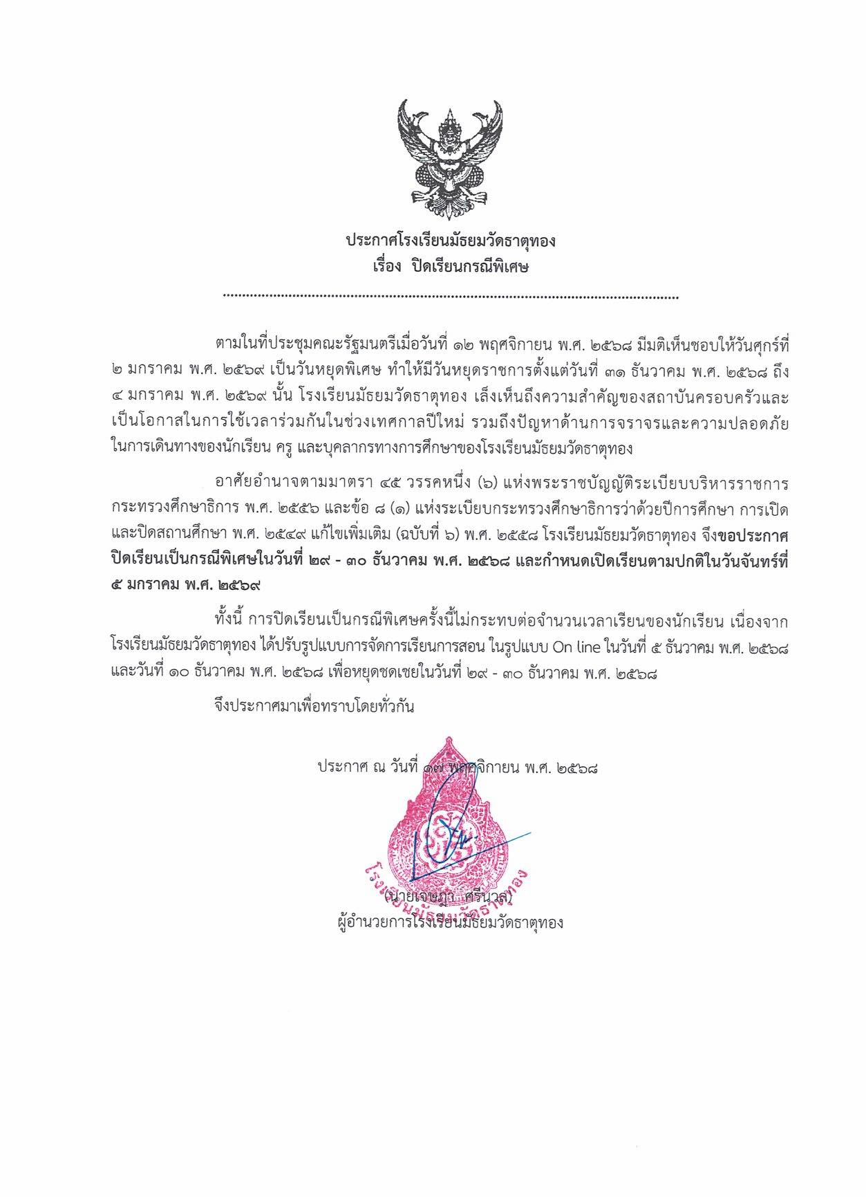 จากมติคณะรัฐมนตรีเมื่อวันที่ 12 พฤศจิกายน 2568 เห็นชอบให้วันที่ 2 มกราคม 2569 เป็นวันหยุดพิเศษ ส่งผลให้ช่วงวันหยุดราชการต่อเนื่องในเทศกาลปีใหม่ ระหว่างวันที่ 31 ธันวาคม 2568–4 มกราคม 2569 โรงเรียนมัธยมวัดธาตุทองจึงพิจารณาประกาศปิดเรียนเป็นกรณีพิเศษเพิ่มเติม