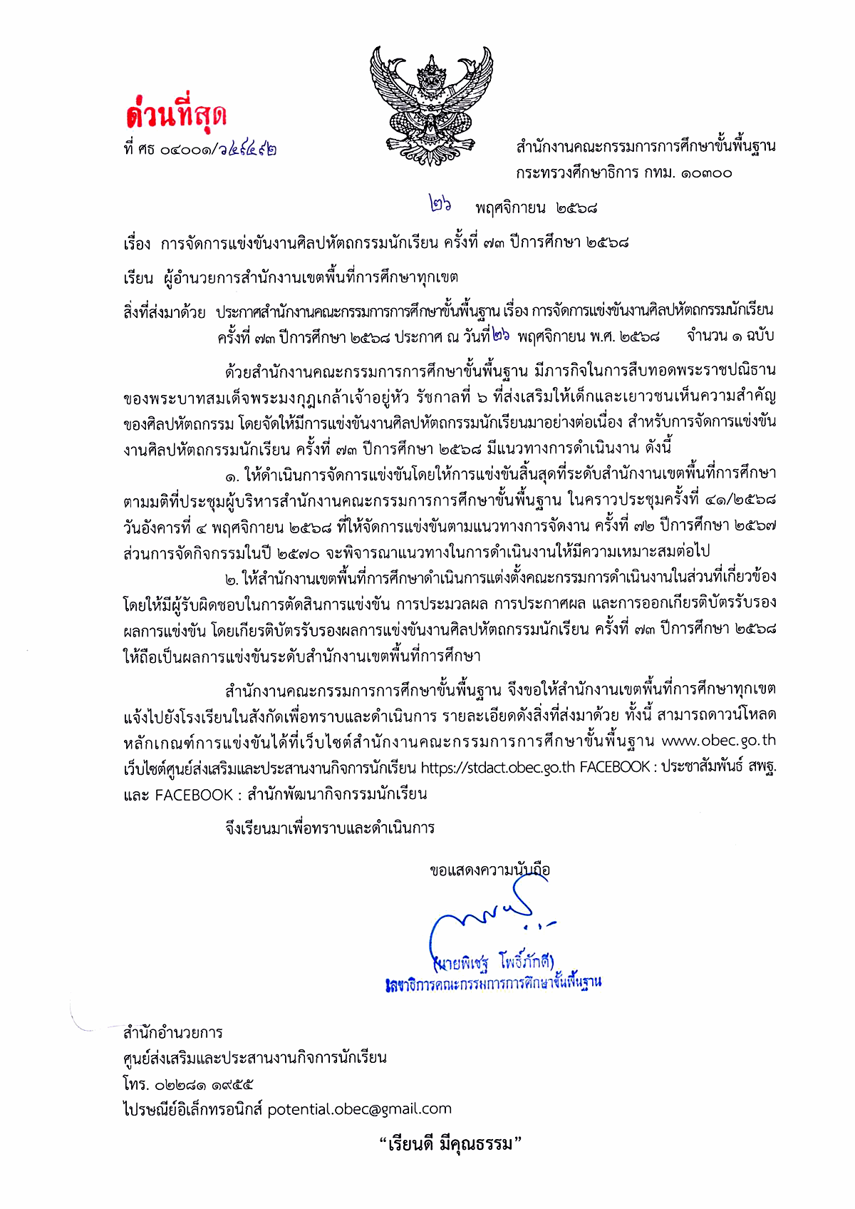 หนังสือด่วนที่สุดฉบับนี้แนบประกาศ สพฐ. เรื่อง การจัดการแข่งขันงานศิลปหัตถกรรมนักเรียน ครั้งที่ 73 ปีการศึกษา 2568 ประกาศ ณ วันที่ 26 พฤศจิกายน 2568 เพื่อใช้เป็นแนวทางในการจัดกิจกรรมศิลปหัตถกรรมของนักเรียนทั่วประเทศ โดยยังคงหลักการสืบทอดพระราชปณิธานของพระบาทสมเด็จพระมงกุฎเกล้าเจ้าอยู่หัว รัชกาลที่ 5 ที่ทรงส่งเสริมให้เด็กและเยาวชนเห็นความสำคัญของงานศิลปหัตถกรรมอย่างต่อเนื่อง
