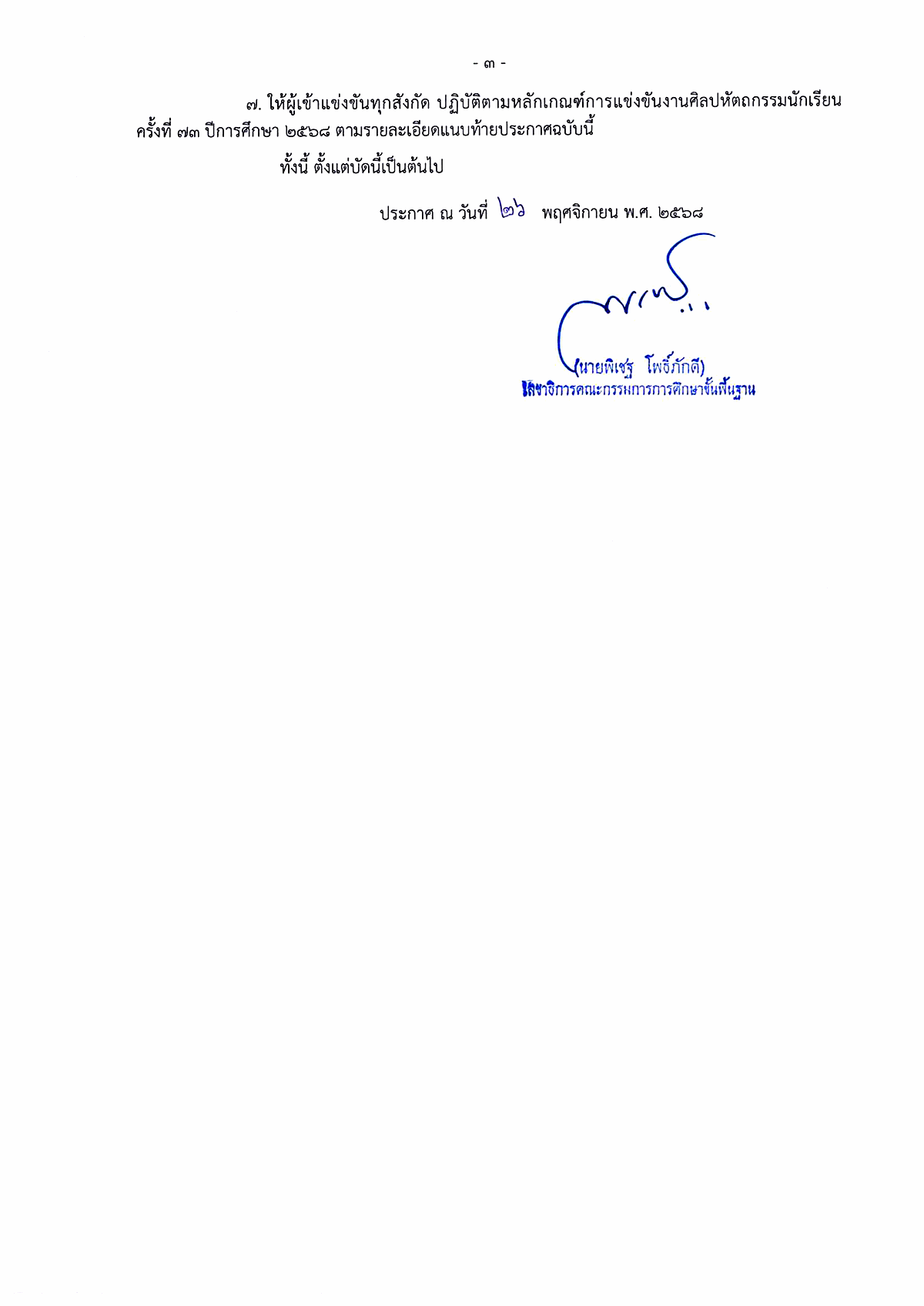 ให้ดำเนินการจัดการแข่งขันงานศิลปหัตถกรรมนักเรียน ครั้งที่ 73 ปีการศึกษา 2568 โดยให้การแข่งขันสิ้นสุดที่ระดับสำนักงานเขตพื้นที่การศึกษา ตามมติที่ประชุมผู้บริหาร สพฐ. ในคราวประชุมวันที่ 4 พฤศจิกายน 2568 และให้ยึดแนวทางการจัดงานตามรูปแบบของงานศิลปหัตถกรรมนักเรียน ครั้งที่ 72 ปีการศึกษา 2567