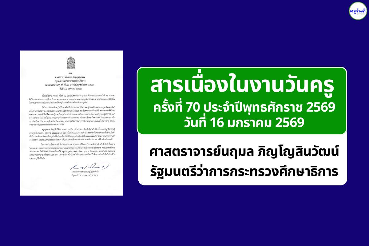สารเนื่องในวันครูปีนี้ จัดขึ้นภายใต้แนวคิด "พระผู้ทรงเป็นแม่และครูแห่งแผ่นดิน" เพื่อน้อมรำลึกถึงพระมหากรุณาธิคุณของสมเด็จพระนางเจ้าสิริกิติ์ พระบรมราชินีนาถ พระบรมราชชนนีพันปีหลวง ผู้ทรงเป็นต้นแบบแห่งการให้การศึกษาและการพัฒนาคุณภาพชีวิต