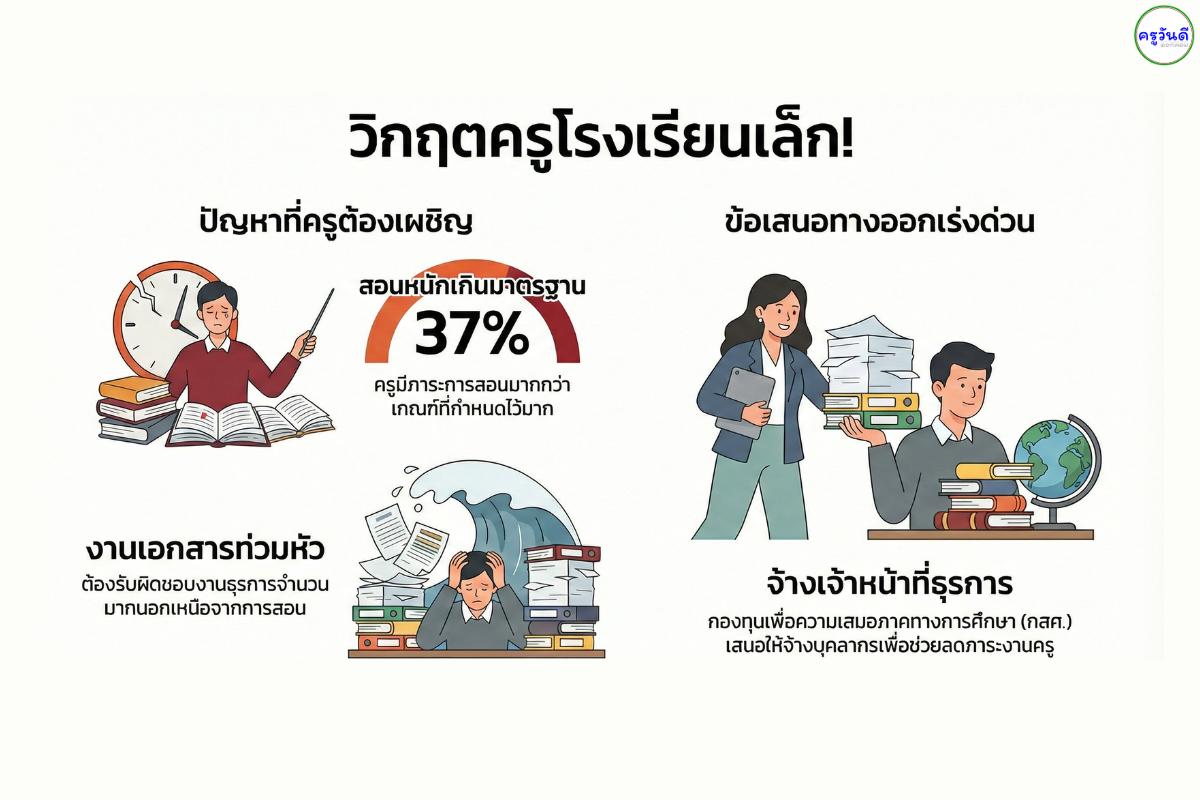 - ภาระงานสอนล้น: ครูโรงเรียนขนาดเล็กสอนเฉลี่ย 27.31 ชม./สัปดาห์ (มาตรฐานสูงสุด 19 ชม.)