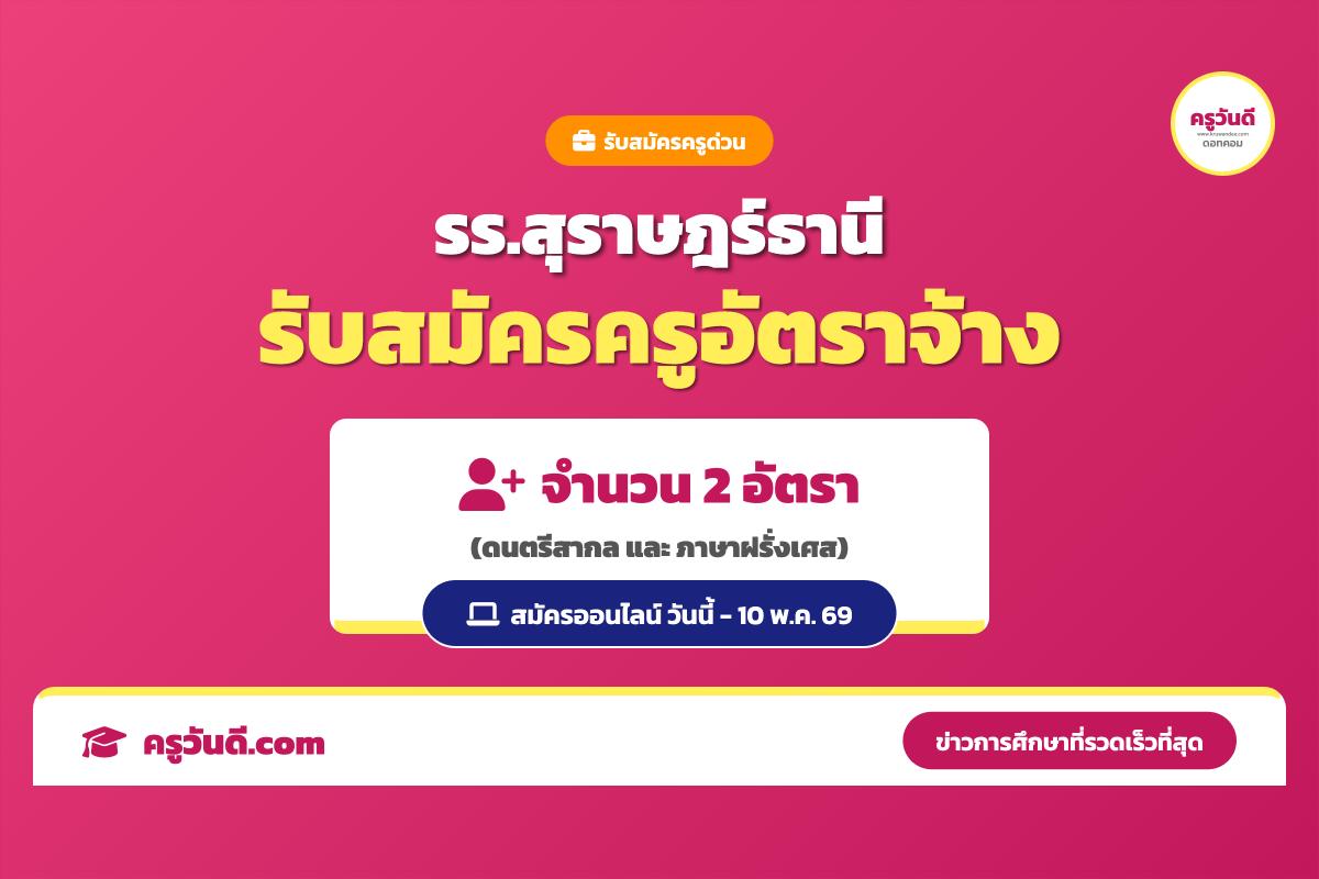 สรุปข่าวรับสมัครงาน: ประกาศโรงเรียนสุราษฎร์ธานี เรื่อง การรับสมัครลูกจ้างชั่วคราว ตำแหน่งครูอัตราจ้าง จำนวน 2 อัตรา (วิชาเอกดนตรีสากล 1 อัตรา และ วิชาเอกภาษาฝรั่งเศส 1 อัตรา) อัตราค่าตอบแทน 10,950 บาท/เดือน โดยเปิดรับสมัครผ่านระบบออนไลน์ ตั้งแต่บัดนี้ จนถึงวันที่ 10 พฤษภาคม 2569 ครับ