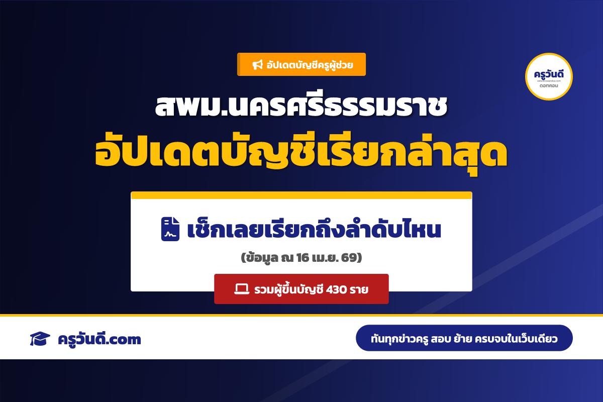 สวัสดีเพื่อน ๆ สมาชิก ครูวันดีดอทคอม (Kruwandee.com) ทุกท่านครับ วันนี้แอดมินนำข้อมูลอัปเดตความเคลื่อนไหวบัญชีผู้สอบแข่งขันได้เข้ารับราชการเป็นข้าราชการครูและบุคลากรทางการศึกษา ตำแหน่งครูผู้ช่วย สังกัด สพม.นครศรีธรรมราช (ข้อมูล ณ 16 เมษายน 2569) ครอบคลุมประกาศ อ.ก.ค.ศ. เขตพื้นที่ฯ จำนวน 2 รอบ รวมผู้ขึ้นบัญชี 430 ราย เรียกบรรจุแล้ว 136 ราย ให้ อ.ก.ค.ศ. อื่นใช้บัญชี 36 ราย และคงเหลือผู้รอบรรจุในบัญชี 249 ราย