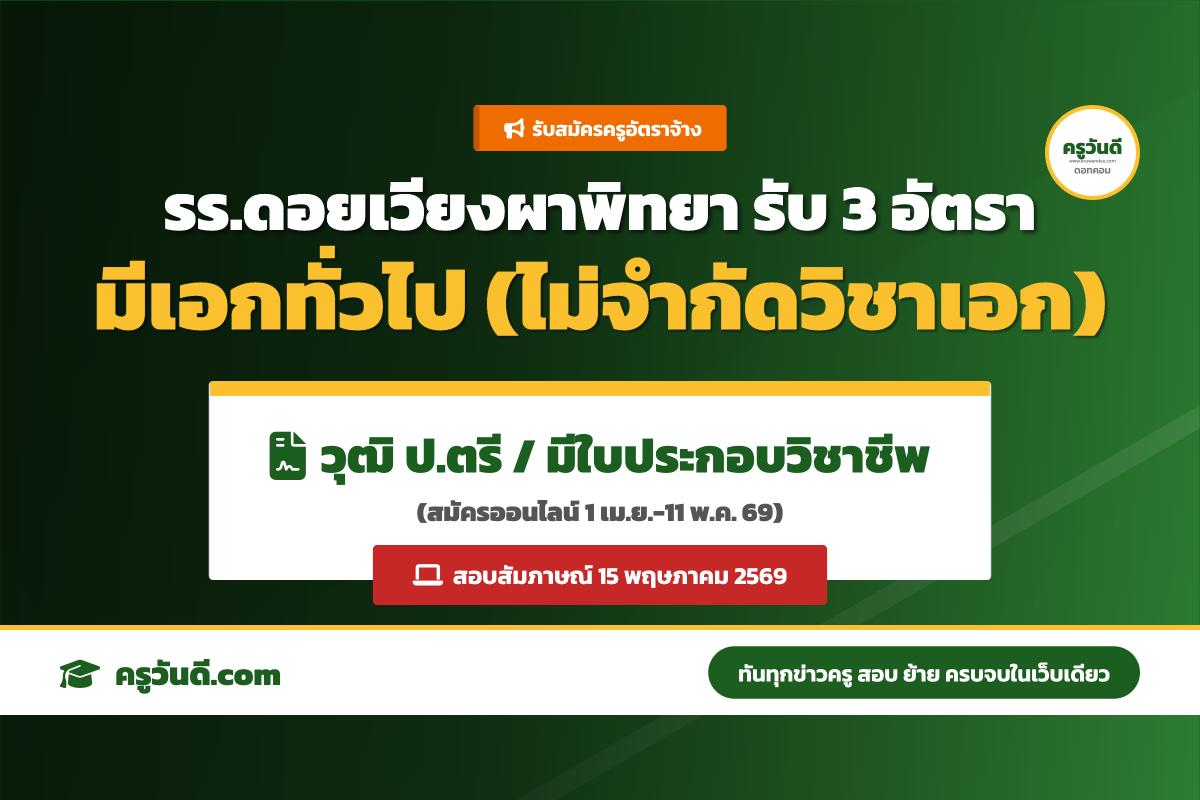 โรงเรียนดอยเวียงผาพิทยา รับสมัครครูอัตราจ้าง 3 อัตรา (สมัครออนไลน์ 1 เม.ย.-11 พ.ค. 69)